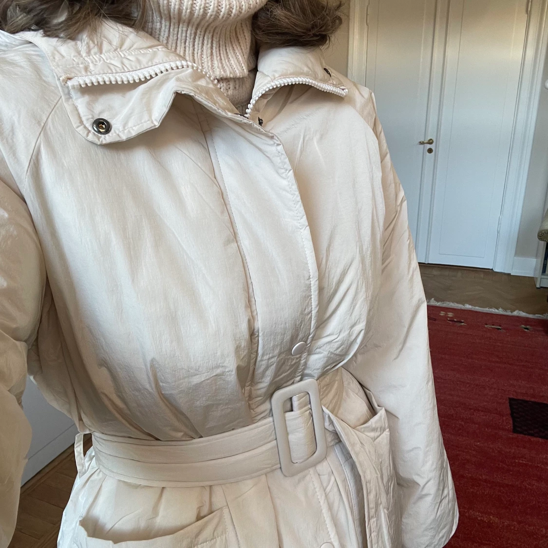 Puffig jacka som antigen är snygg och lite Classy med skärp eller lite enklare och rak model utan. Den är inte riktigt min stil så har tyvärr inte kommer till så mycket användning men hoppas att den kan få ett nytt hem!