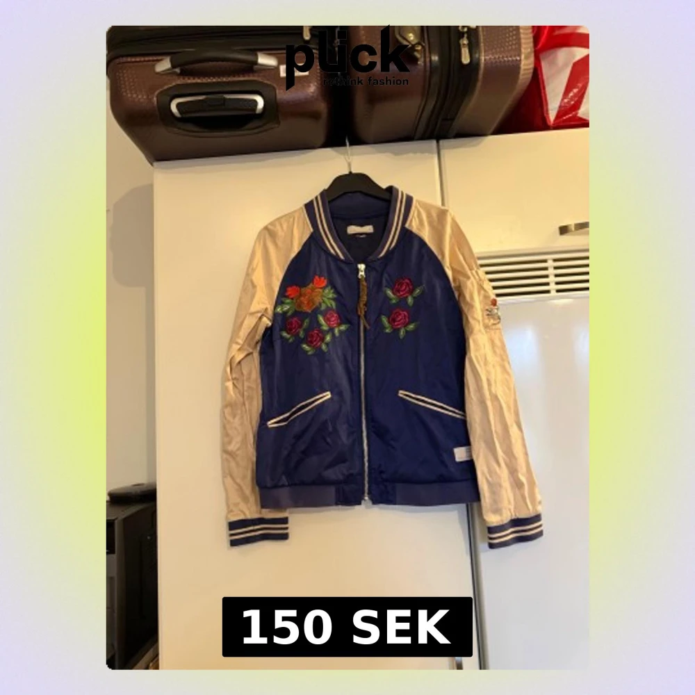 Snygg blå bomberjacka från Odd Molly med beige ärmar och broderade blommor framtill samt en stor orange fjäril på ryggen. Jackan har dragkedja, randiga muddar och detaljerade fickor. Perfekt för dig som vill sticka ut med coola broderier och sportig stil. Från märket Odd Molly. Storlek 2 som enligt deras storleksguide motsvarar en M. Mer använd men otroligt vacker skick.