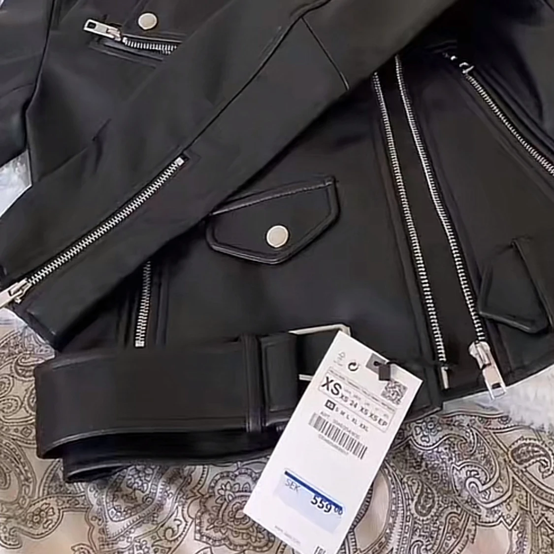 Skinnjacka från Zara. Är i storlek XS. Använd fåtal gånger så är som i nytt skick. Etiketten sitter dock inte kvar som på bilden. Nypris var 559. Jackan finns inte kvar att köpa på Zara.