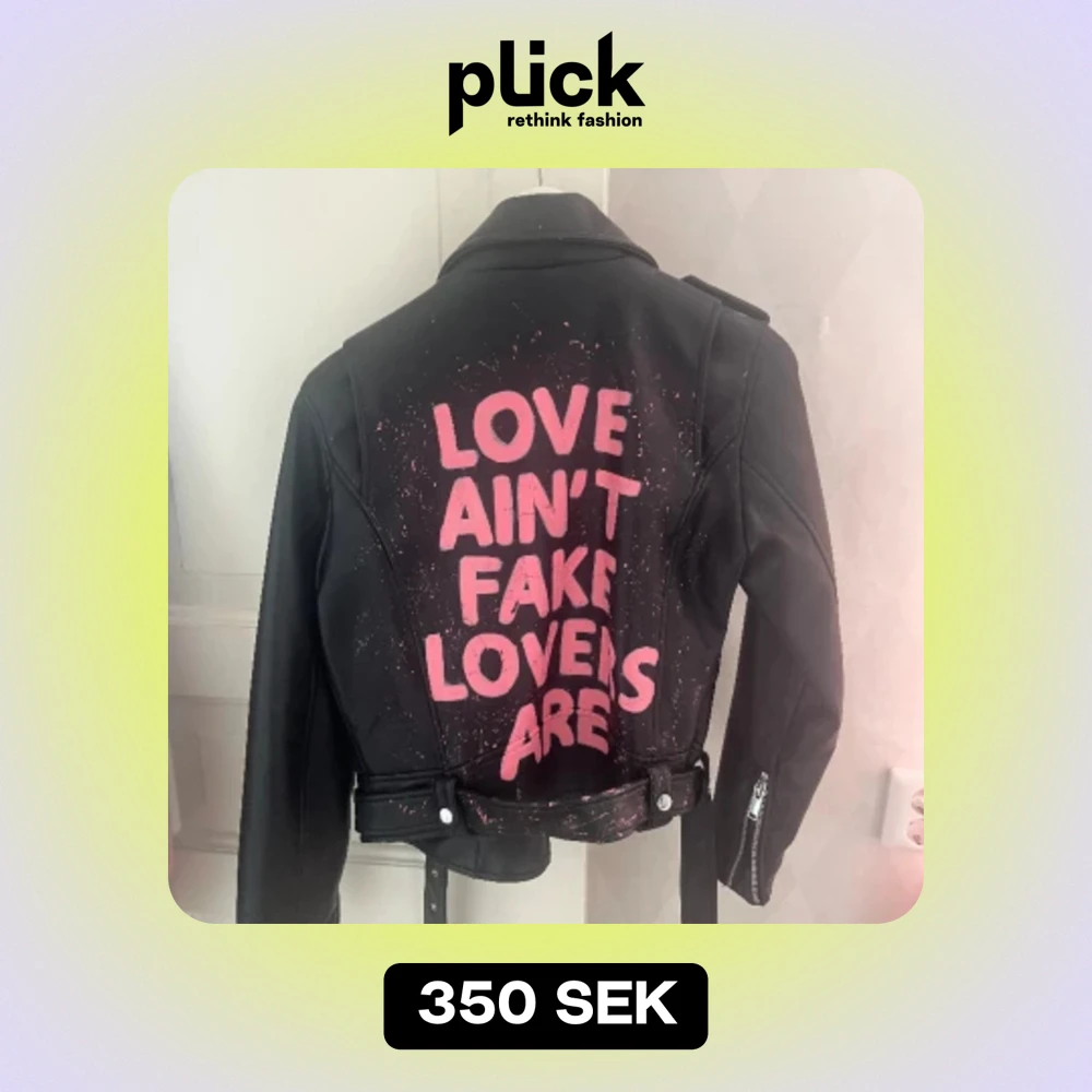 En jättefin skinnjacka som jag köpte av en tjej som designa eget för något år sedan!! Jackan är i storlek Medium men skulle säga att den sitter mer som Small!! Pris går att diskuteras , hör av dig vid mer frågor 🙌🏼🩷
