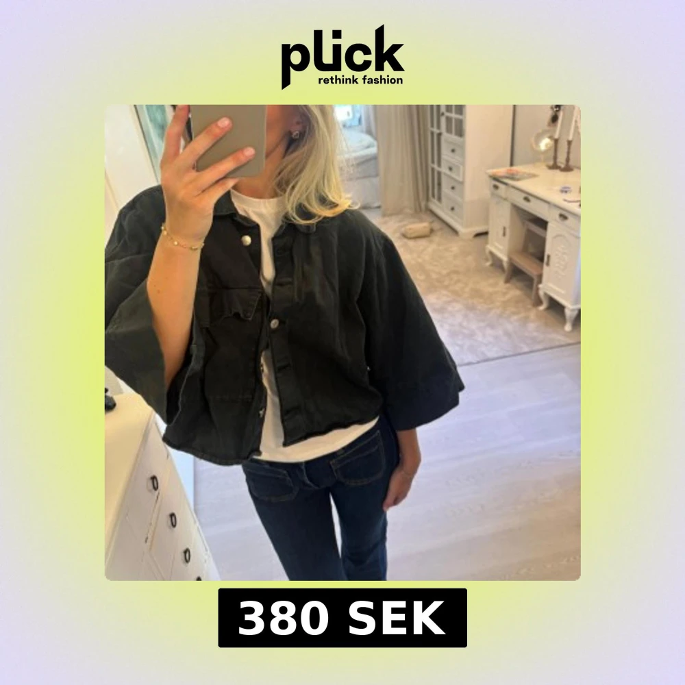Storlek L (jag på bilden brukar ha storlek s som referens) Säljer en svart overshirt/jeansjacka med breda trekvartsärmar och coola knappar framtill. Jackan har en stor ficka på bröstet. Perfekt för dig som gillar en loose och avslappnad look.