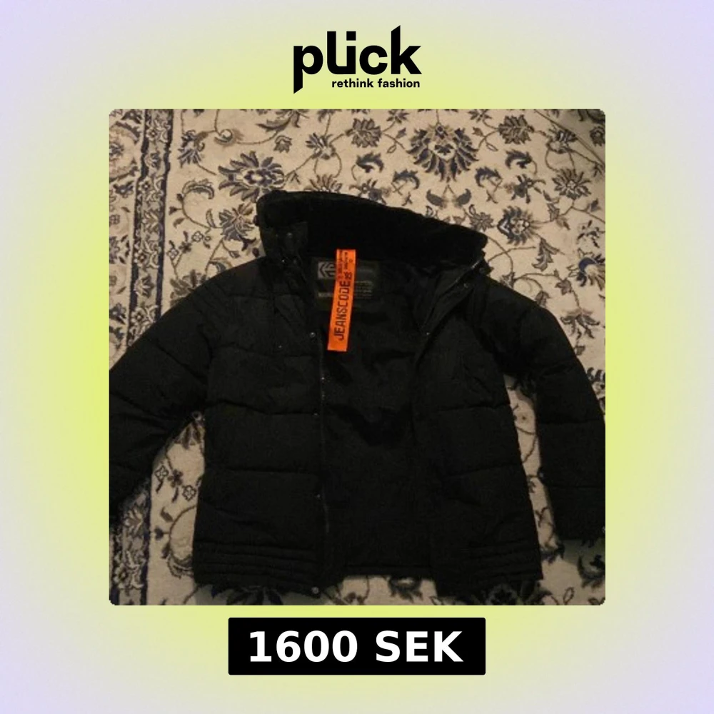 Svart pufferjacka från Jeanscode med huva och diskret logga på ärmen. Jackan har quiltad design, dragkedja och knappar framtill. Perfekt för kalla dagar och har en modern, stilren look. Fodrad insida för extra värme.