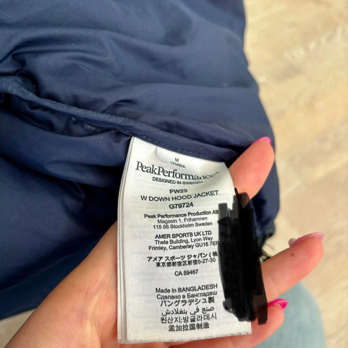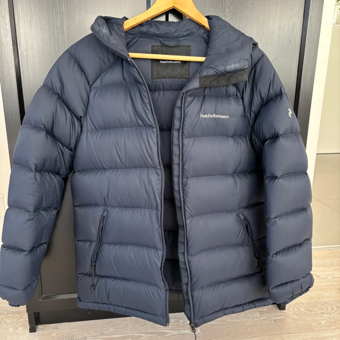 Snygg mörkblå dunjacka från Peak Performance med huva och dragkedja framtill. Jackan har två fickor med dragkedja och diskret logga på bröstet och ärmen. Perfekt för kalla dagar och riktigt skön att bära. Den är köpt för 3500kr. Den är i storlek M.💓💓