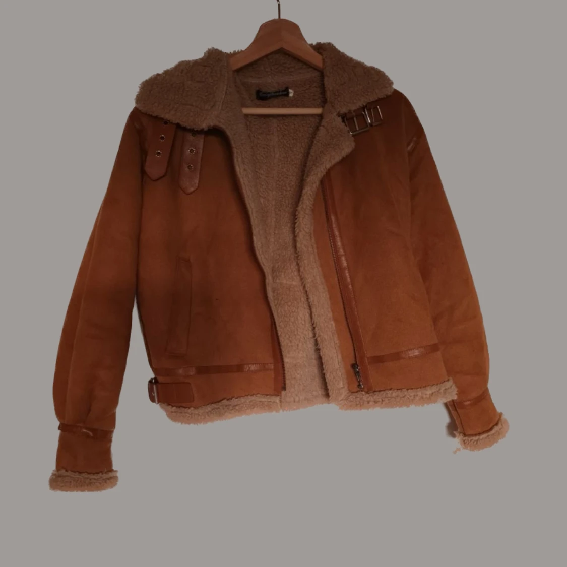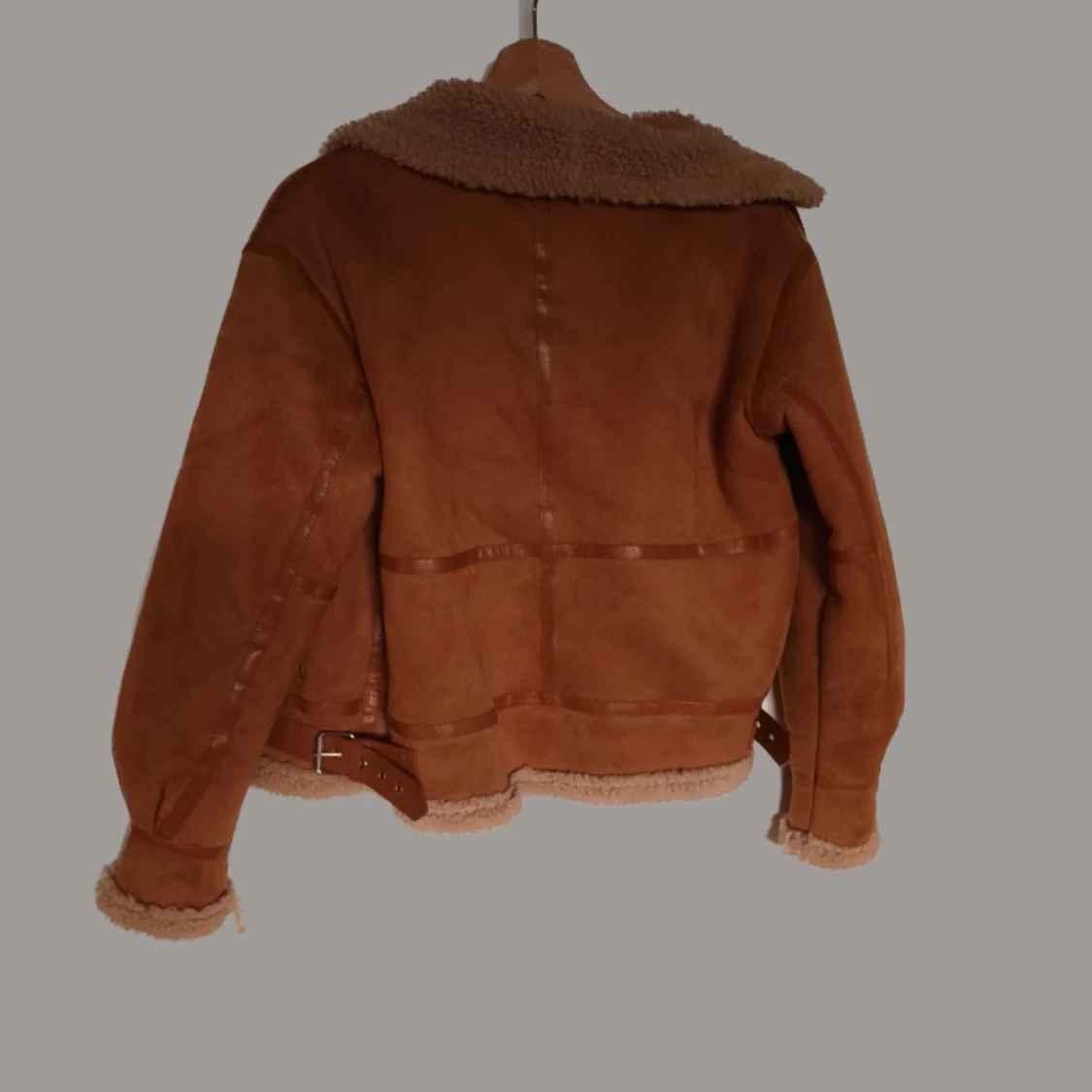 faux allt! spännen i hals och midja. fin men har en typ likadan. är 170cm och den är liite kort i ärmarna på mig.