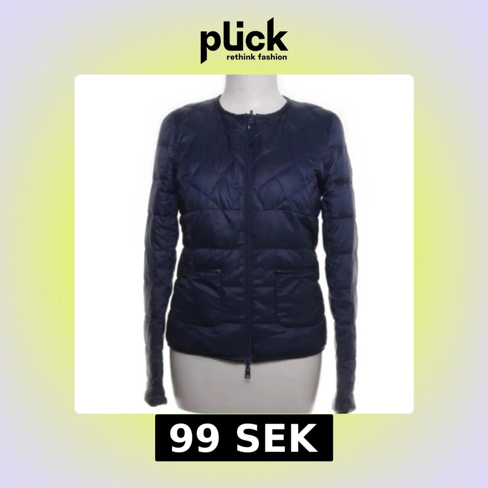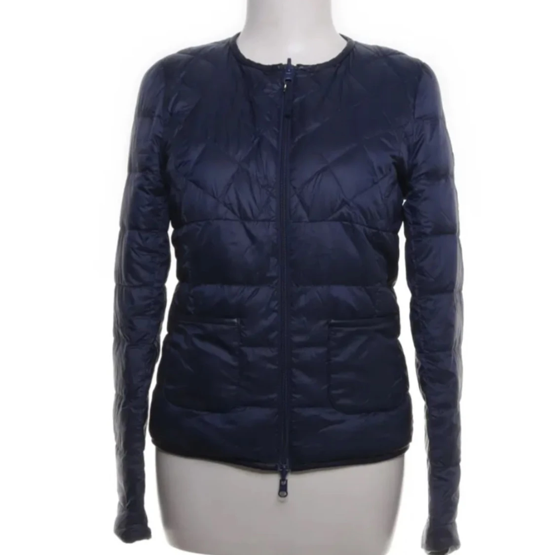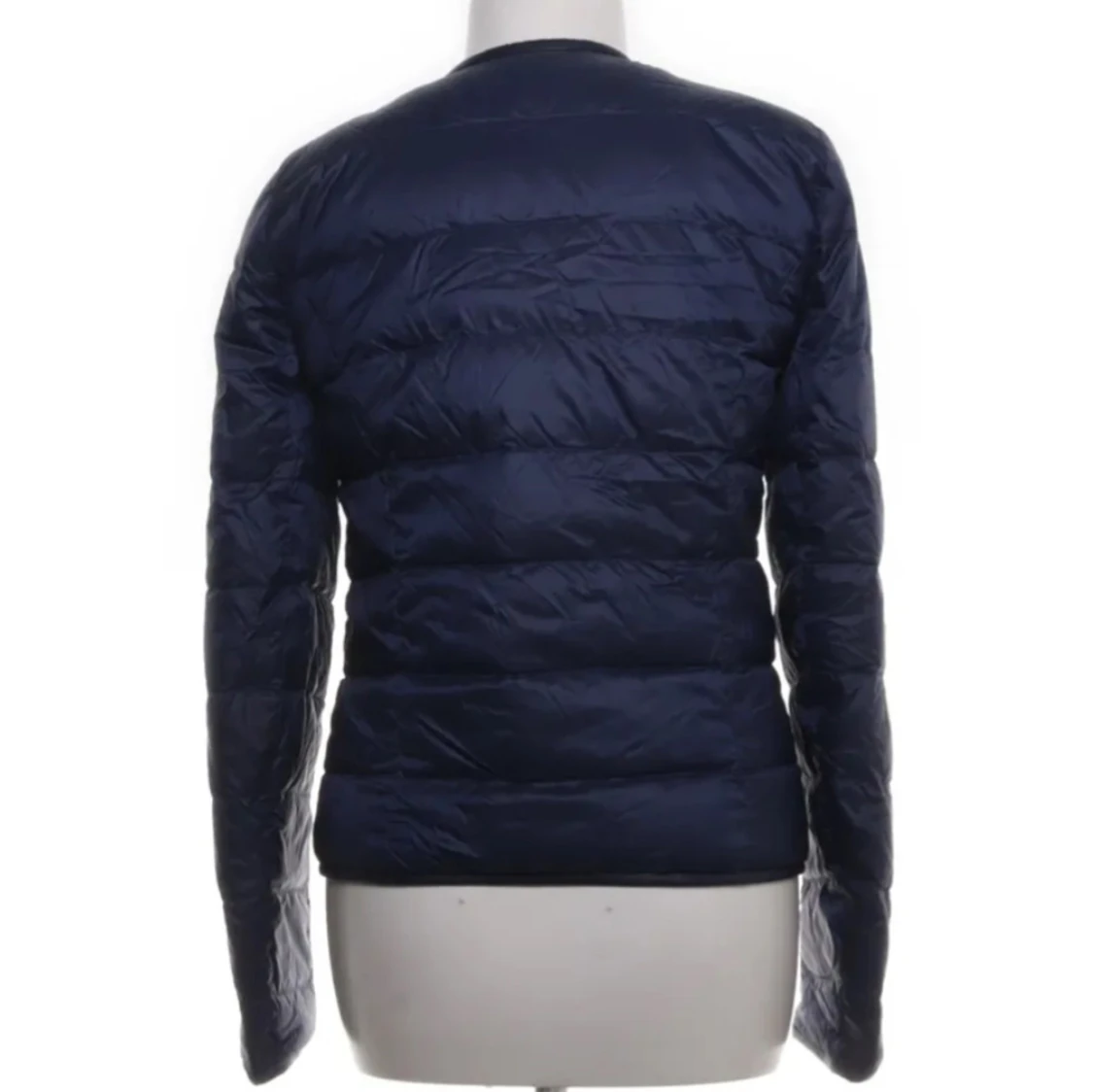 Snygg mörkblå dunjacka med quiltad design och dragkedja framtill.