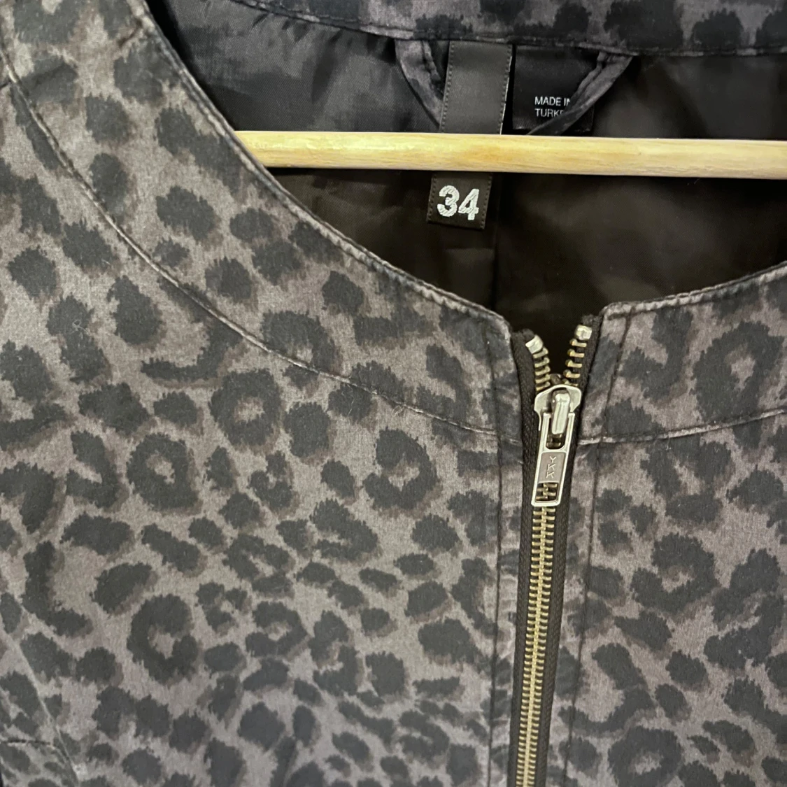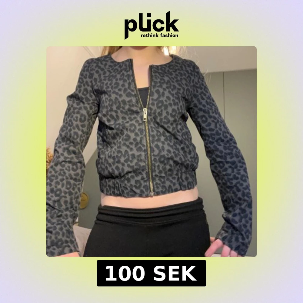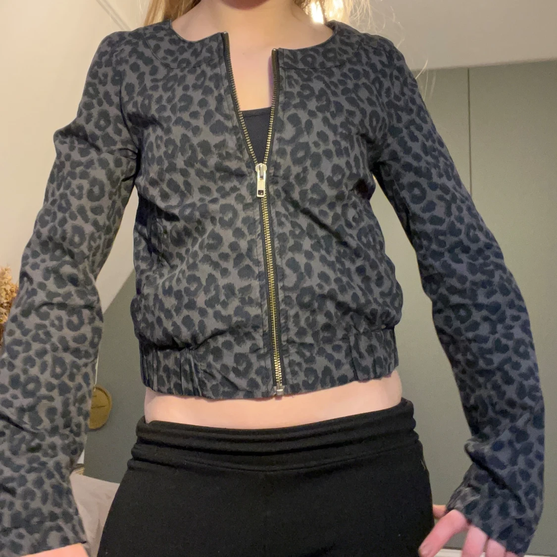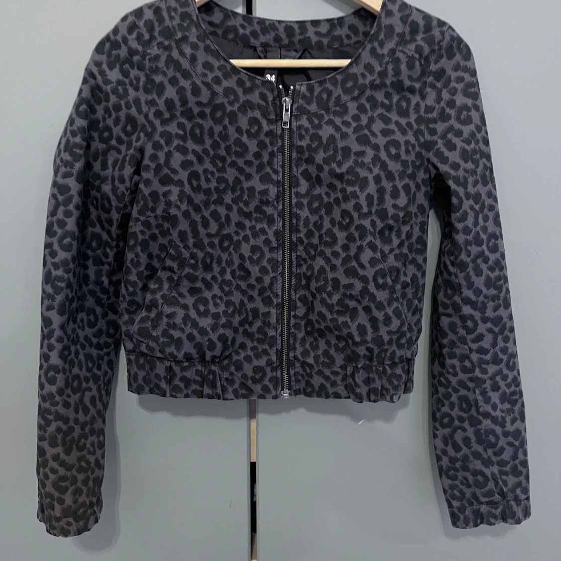 Säljer en gråsvart leopardmönstrad jacka med dragkedja framtill. Jackan har rund halsringning, långa ärmar och en croppad passform.
