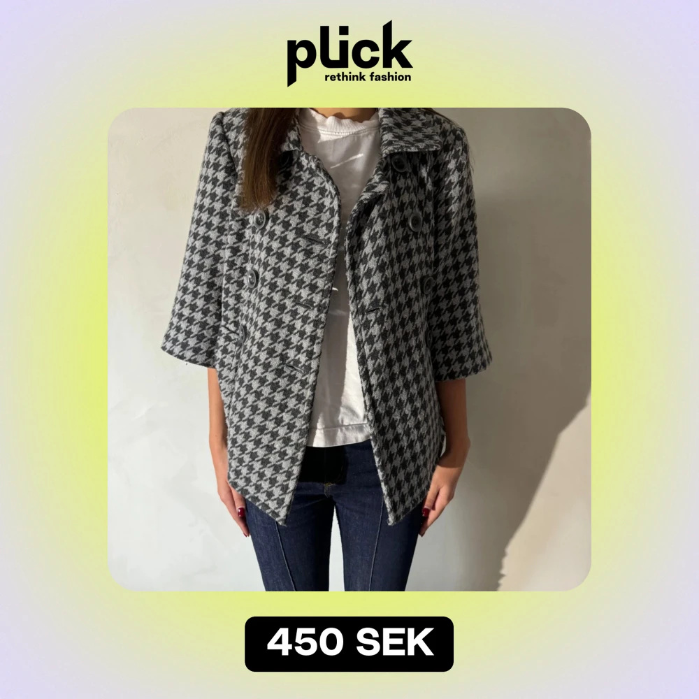 Säljer en superfin grå och svart rutig kappa i hundtandsmönster med trekvartsärm. Den har stora knappar framtill och en klassisk krage. Perfekt för höst och vår när du vill vara både stilren och bekväm.