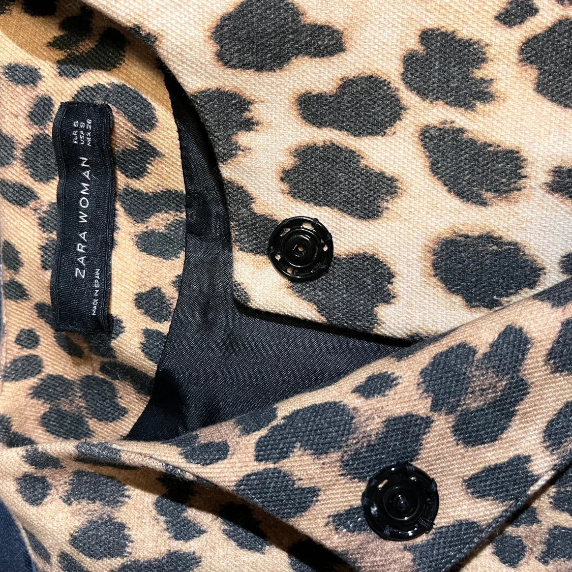 Snygg leopardmönstrad klänning från Zara Perfekt för att sticka ut med stil. Klänningen har en klassisk design med knappar framtill. Inga defekter eller skada vad jag ser:) totala längden är 83 cm, dm vid frågor