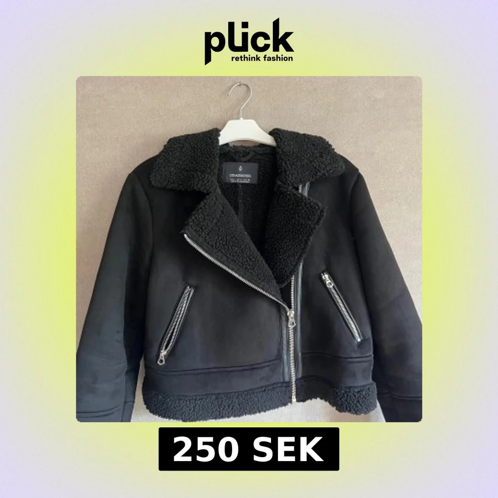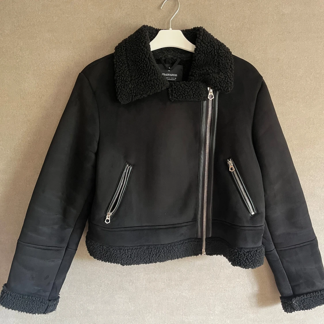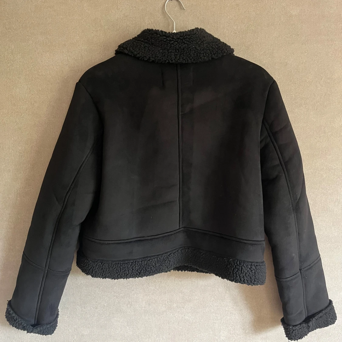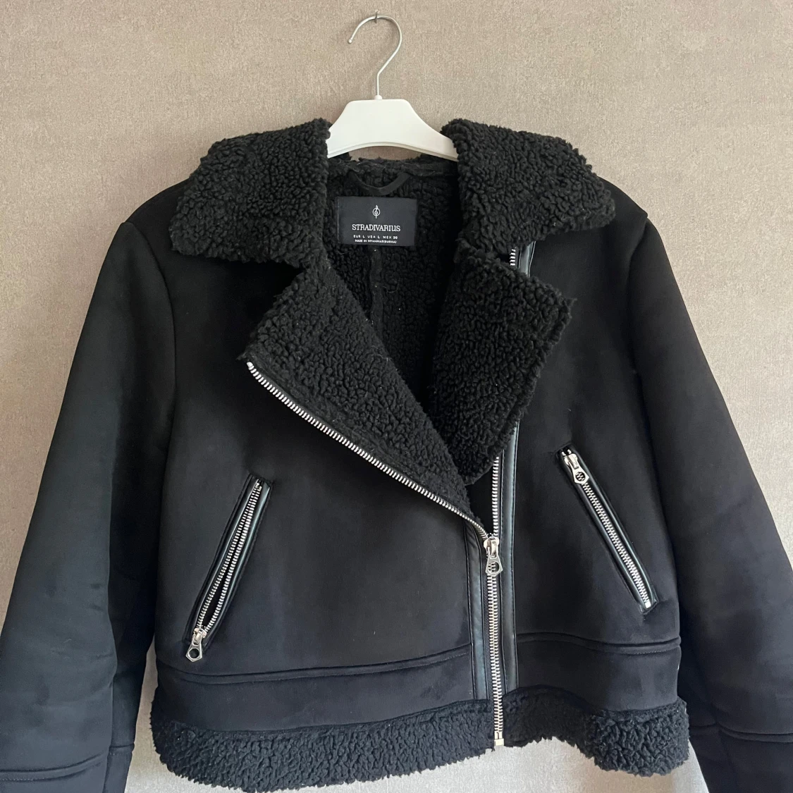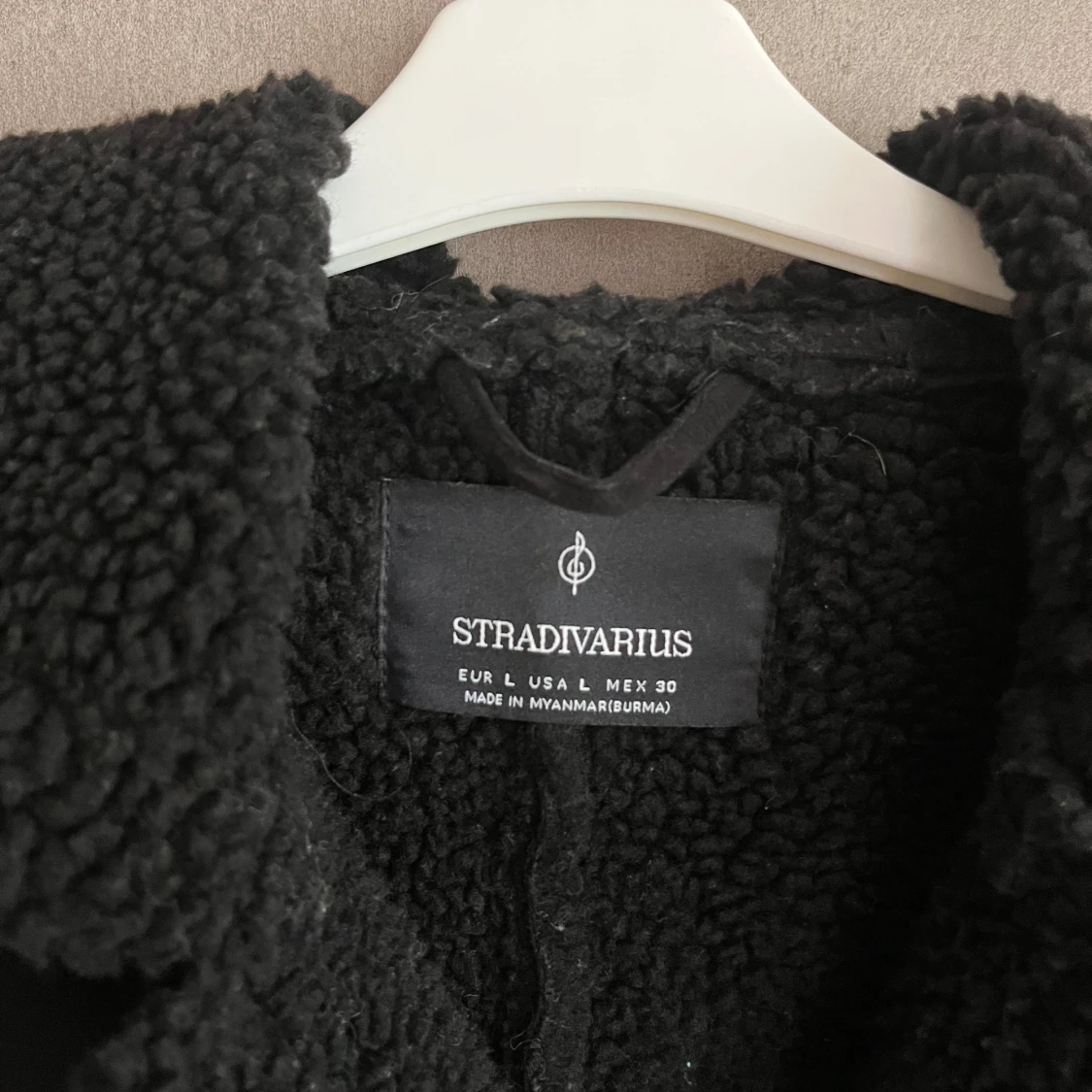Svart mocka jacka med teddyfoder och teddydetaljer. Jackan är ifrån Stradivarius i storlek L men passar som en S💗
