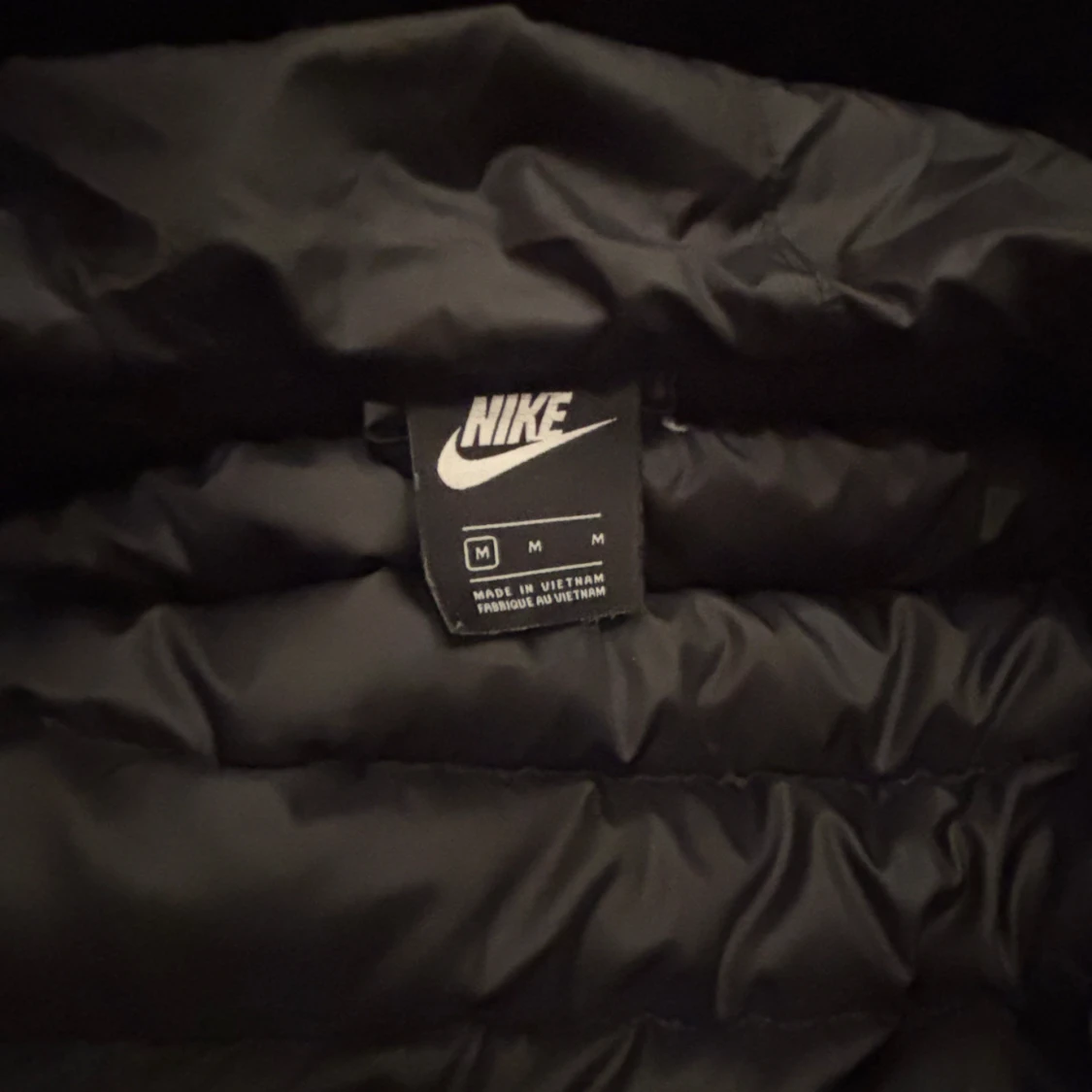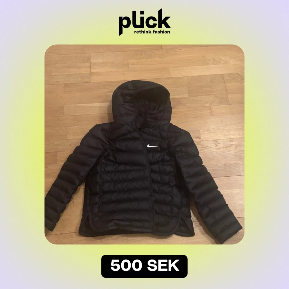 Säljer en svart dunjacka från Nike i storlek M. Jackan har en sportig look med huva och dragkedja framtill. Perfekt för kyliga dagar med sin vadderade design. Den är i mycket bra skick och redo för nya äventyr!