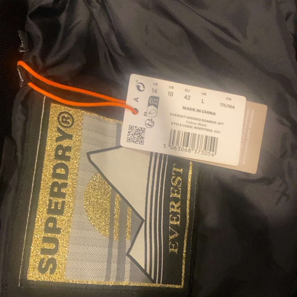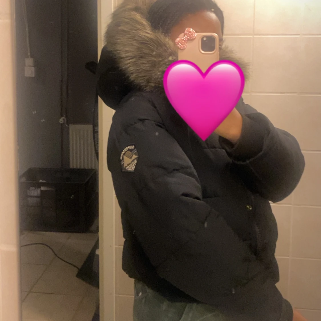 Svart bomberjacka från Superdry, modell Everest, med stor huva och fluffig fuskpäls. Jackan har Superdry-logga på ärmen och insidan, samt coola detaljer i guld. Croppad passform och rejäla muddar. Perfekt för kalla dagar och riktigt snygg stil. PRIS KAN DISKUTERAS.