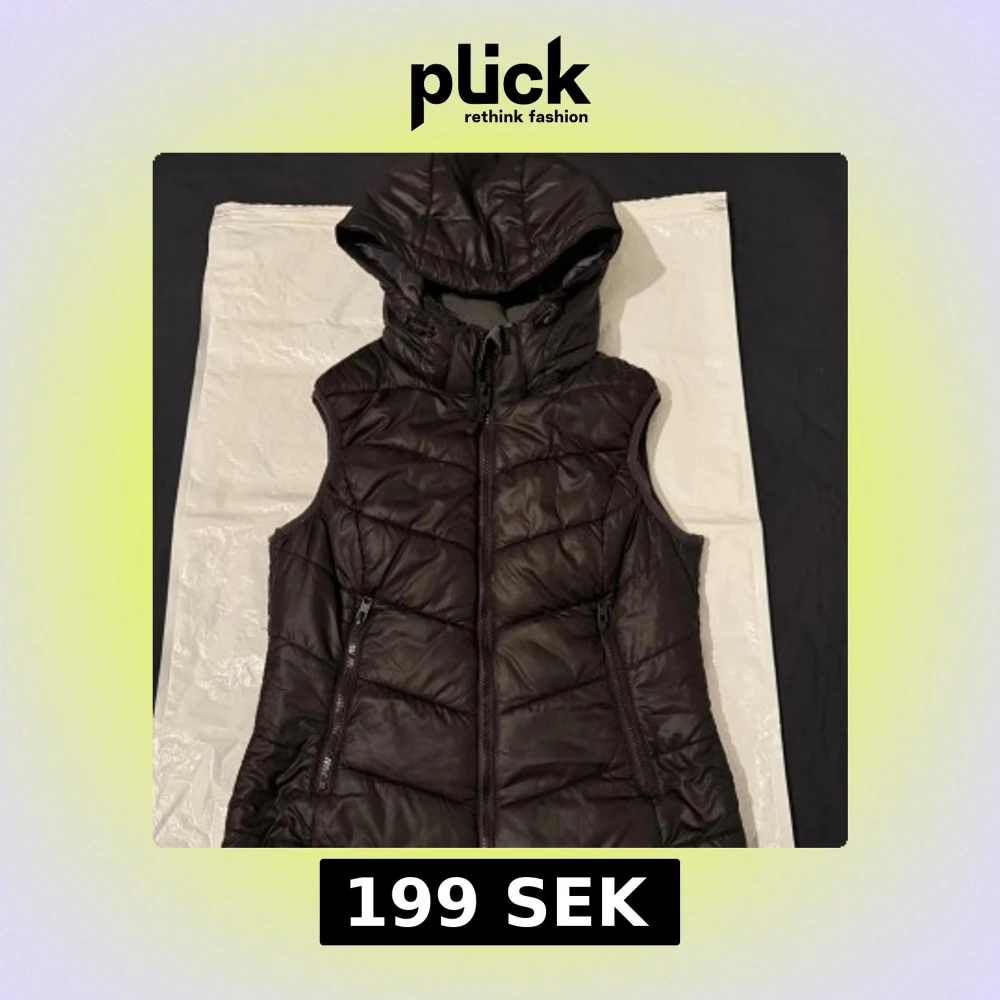 Svart dunväst från H&M Sport med quiltad design och avtagbar huva. Västen har dragkedja framtill och två fickor med dragkedja. Perfekt för lager-på-lager och funkar till både chill och aktivitet.