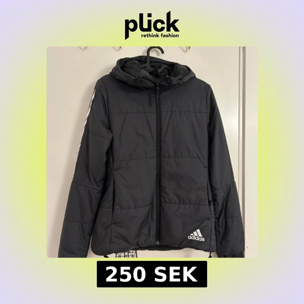 Snygg svart dunjacka från Adidas med huva och dragkedja i storlek XS. Jackan har vita detaljer på ärmarna och Adidas-logga på framsidan. Använd ett fåtal gånger och är i mycket bra skick. Perfekt för de flesta väder.