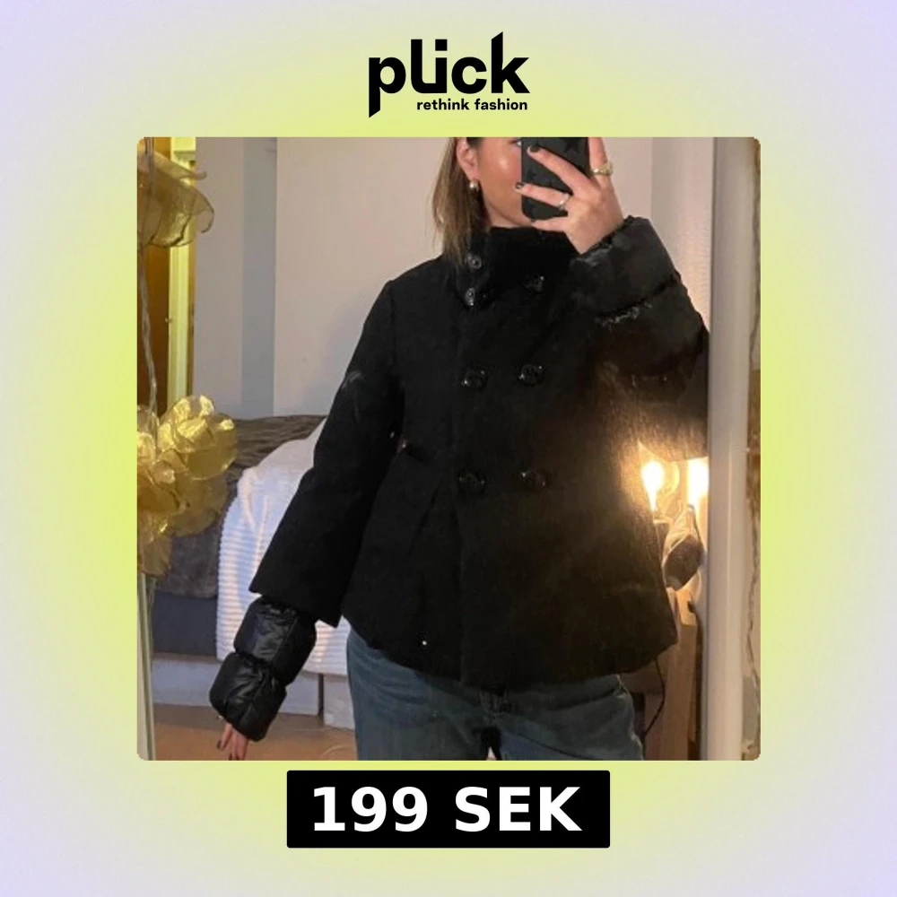 Snygg svart dunjacka från Benetton med dubbelknäppning och hög krage. Jackan är vadderad med 80% dun och 20% fjäder för extra värme. Perfekt för kalla dagar med sin stilrena design och långa ärmar.