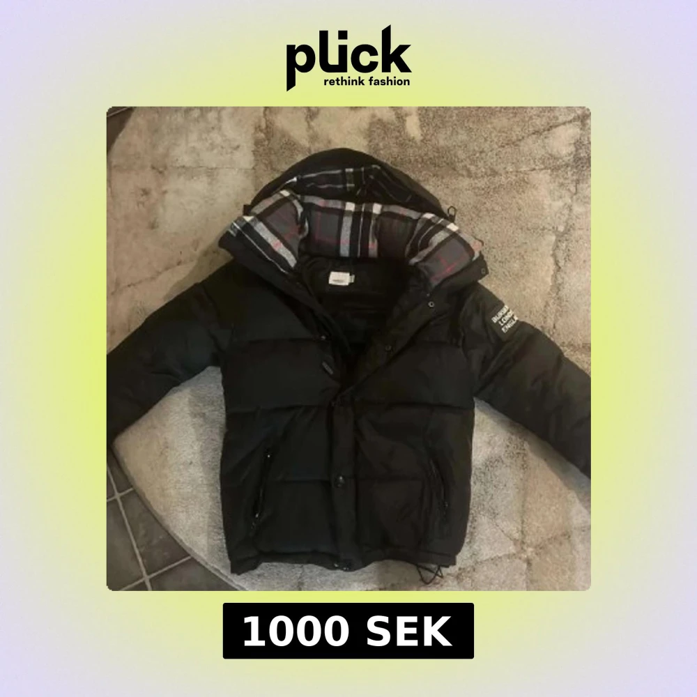 Snygg svart dunjacka från Burberry med en klassisk rutig insida i huvan. Jackan har en dragkedja framtill och en patch med text på ärmen. Perfekt för kyliga dagar. Jag vill sälja jackan för den blev liten på mig så jag tänkte bli av me den