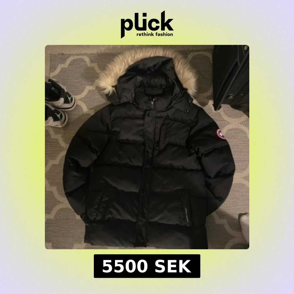 Säljer en svart dunjacka från Canada Goose med huva och snygg fuskpäls. Jackan har klassisk pufferstil, dragkedja och stora fickor framtill. Perfekt för kalla vinterdagar och har den ikoniska loggan på ärmen.
