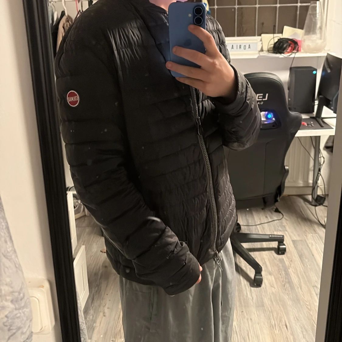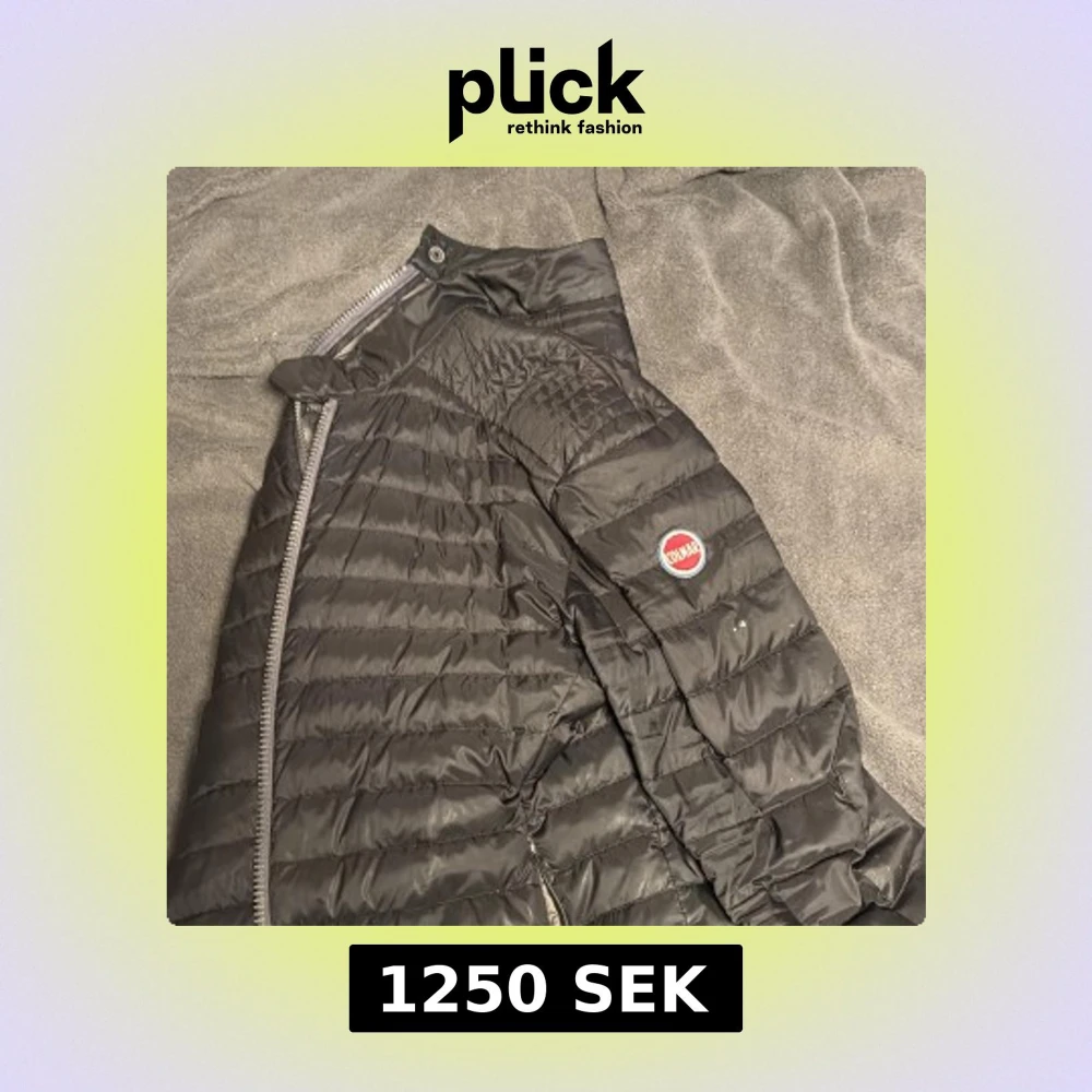 Säljer en svart dunjacka från Colmar med klassisk quiltad design och rund Colmar-logga på ärmen. Jackan har dragkedja framtill och en stilren, enkel look som passar perfekt till höst och vinter. Materialet är lätt och smidigt, vilket gör den enkel att bära.