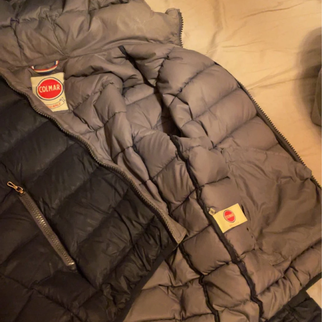 Säljer en snygg svart/marinblå dunjacka från Colmar.jackan är i stolek s och passar perfekt på mig som är 165 cm lång.jag säljer jackan för att ja vill köpa nytt nu till våren.enda skadan på jackan är på märket men det täcker man ej på(syns på sista bilden)