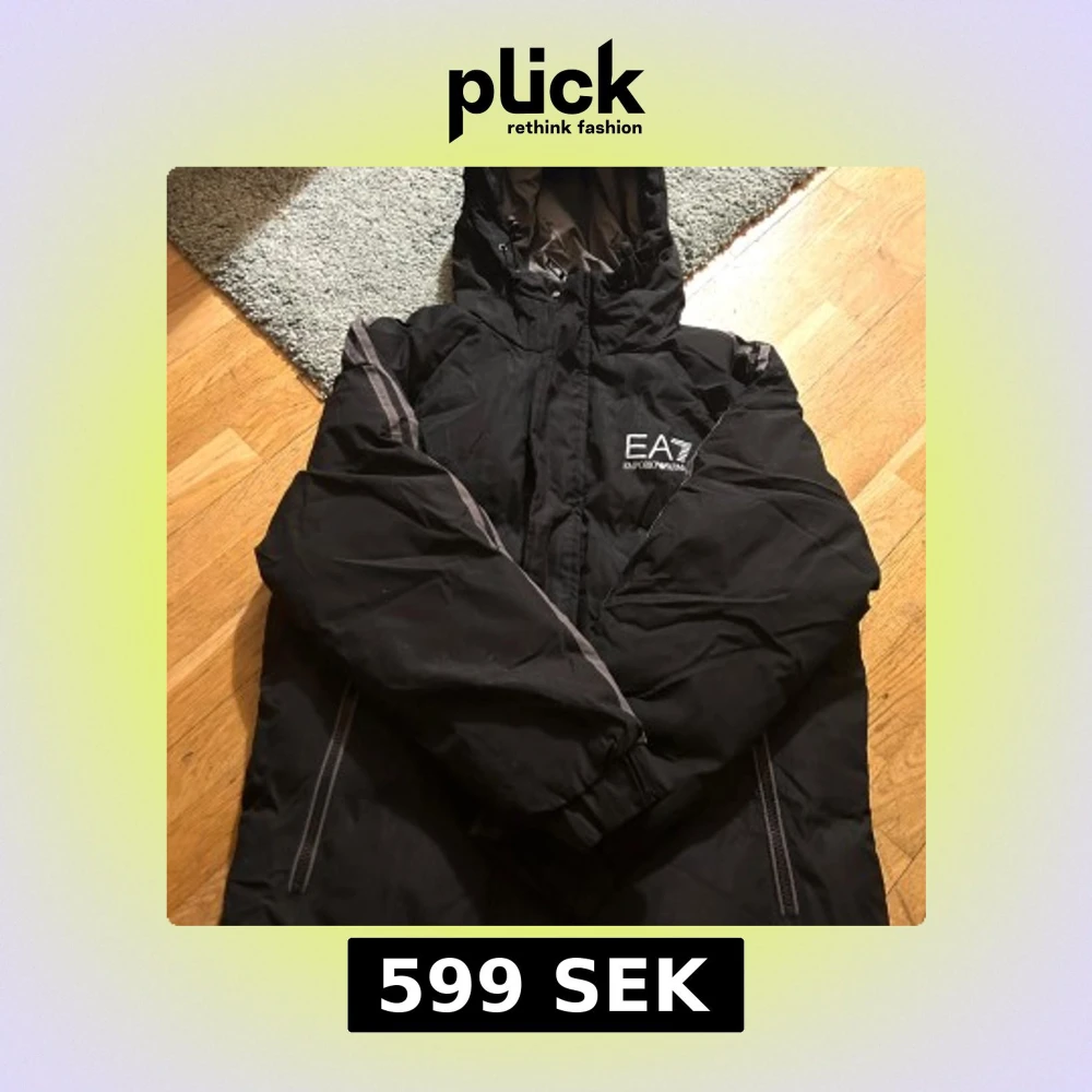 Snygg svart dunjacka från Emporio Armani med huva och dragkedja. Jackan har märkets logga tryckt både fram och bak. Den är nyligen köpt. Materialet är bra på den och den är i storlek M.