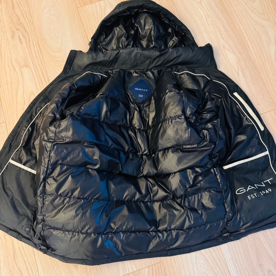 Säljer en stilren svart dunjacka från GANT. Jackan har en praktisk dragkedja och är långärmad. Perfekt för kyligare dagar med sin varma och quiltade design. GANT-loggan syns tydligt på framsidan. Hör av dig vid intresse!