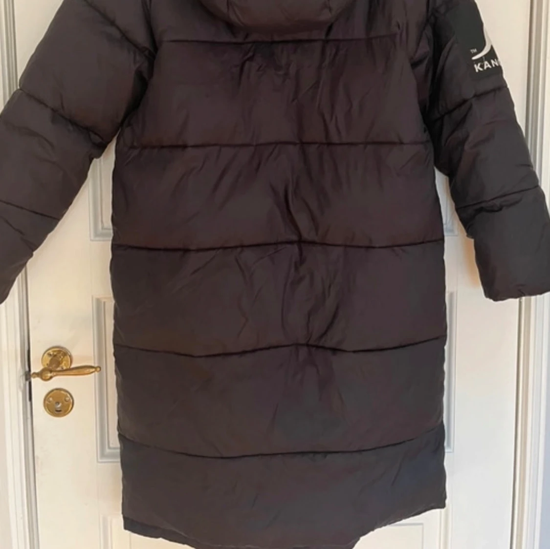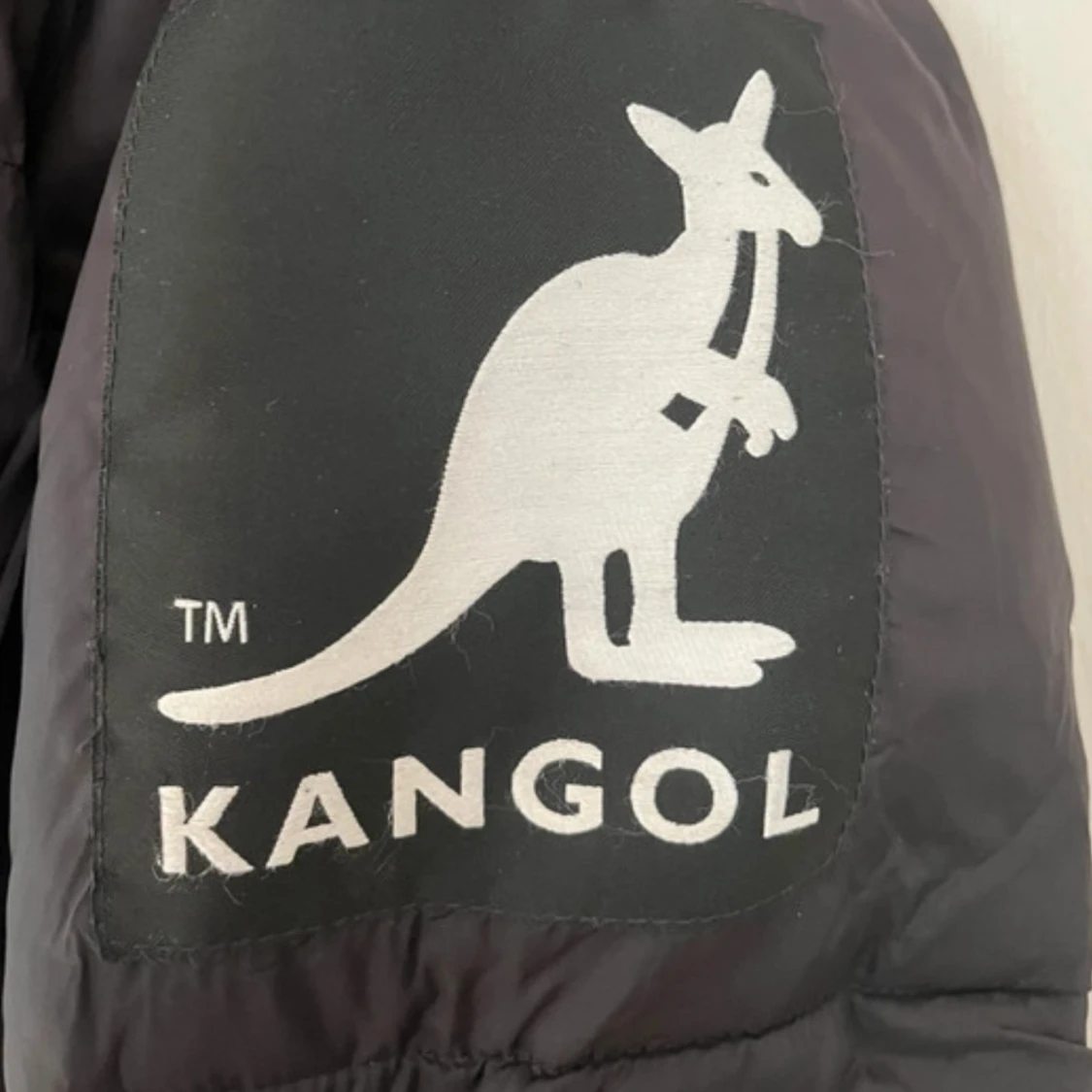Säljer en svart dunjacka från Kangol med huva och dragkedja. Jackan har långa ärmar och två stora fickor framtill. Perfekt för kalla dagar.