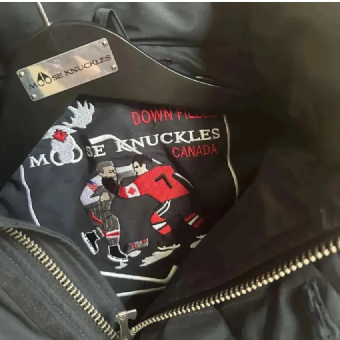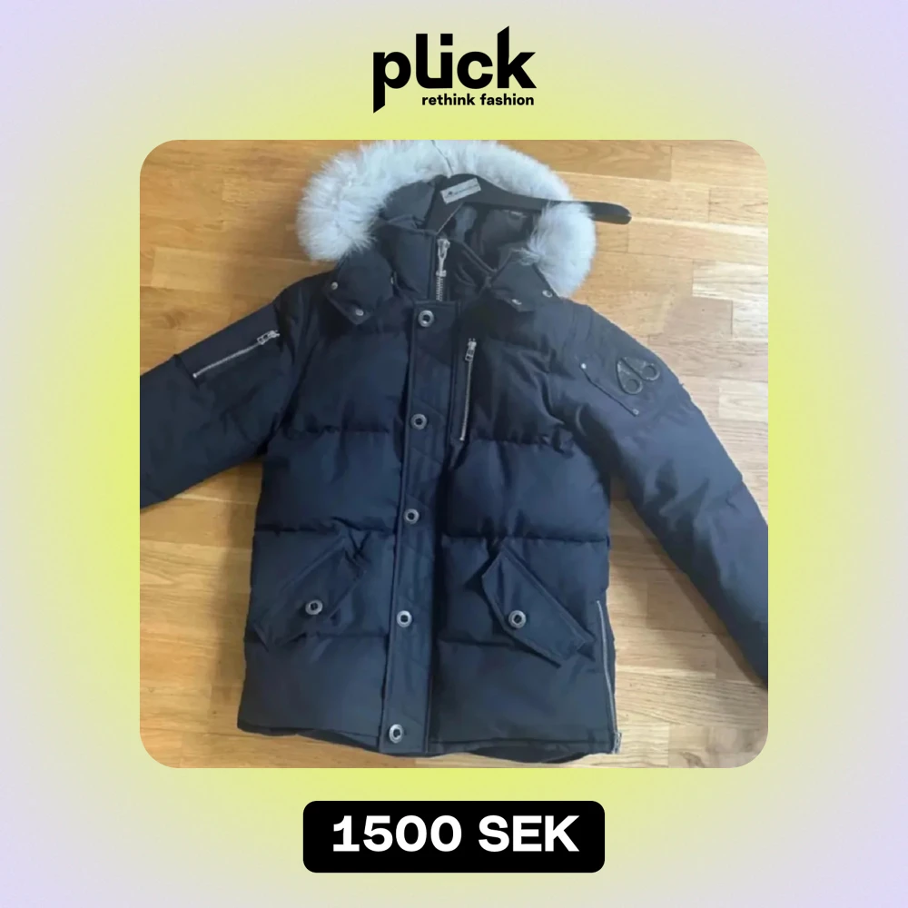 Säljer en svart dunjacka från Moose Knuckles i mycket bra skick. Jackan har en fluffig pälsdetalj på huvan och flera praktiska fickor med dragkedja och knappar. Perfekt för kalla vinterdagar! 🖤