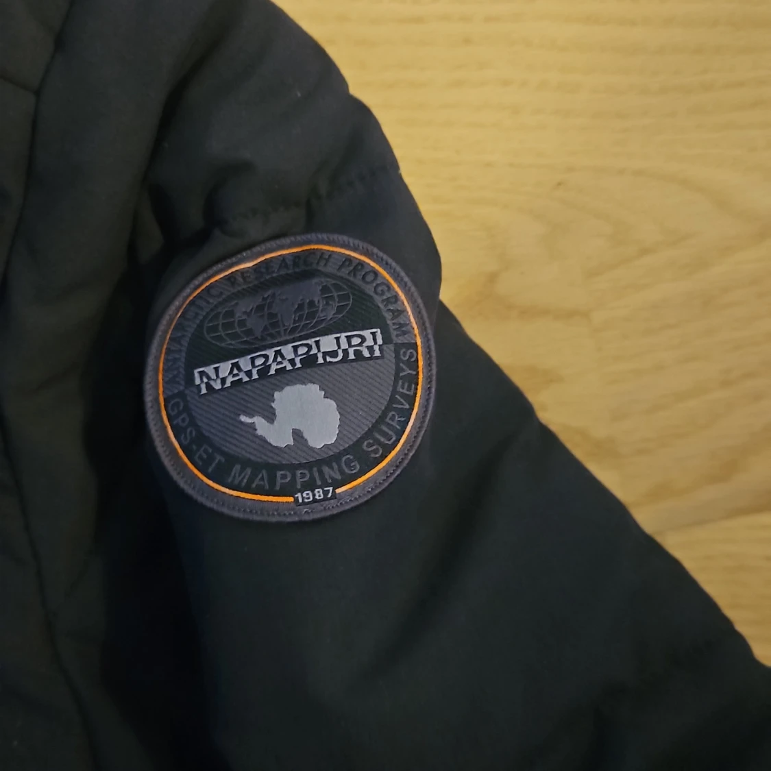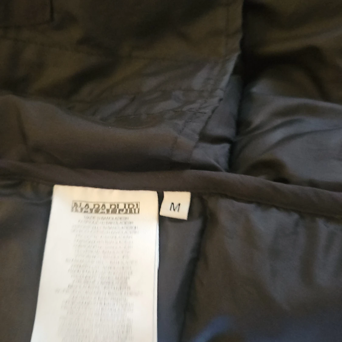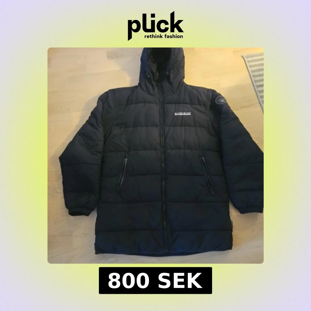 Säljer en svart dunjacka från Napapijri med huva och dragkedja. Jackan har ett märke på ärmen och två fickor med dragkedja framtill. Perfekt för kalla dagar.Nästan ny.