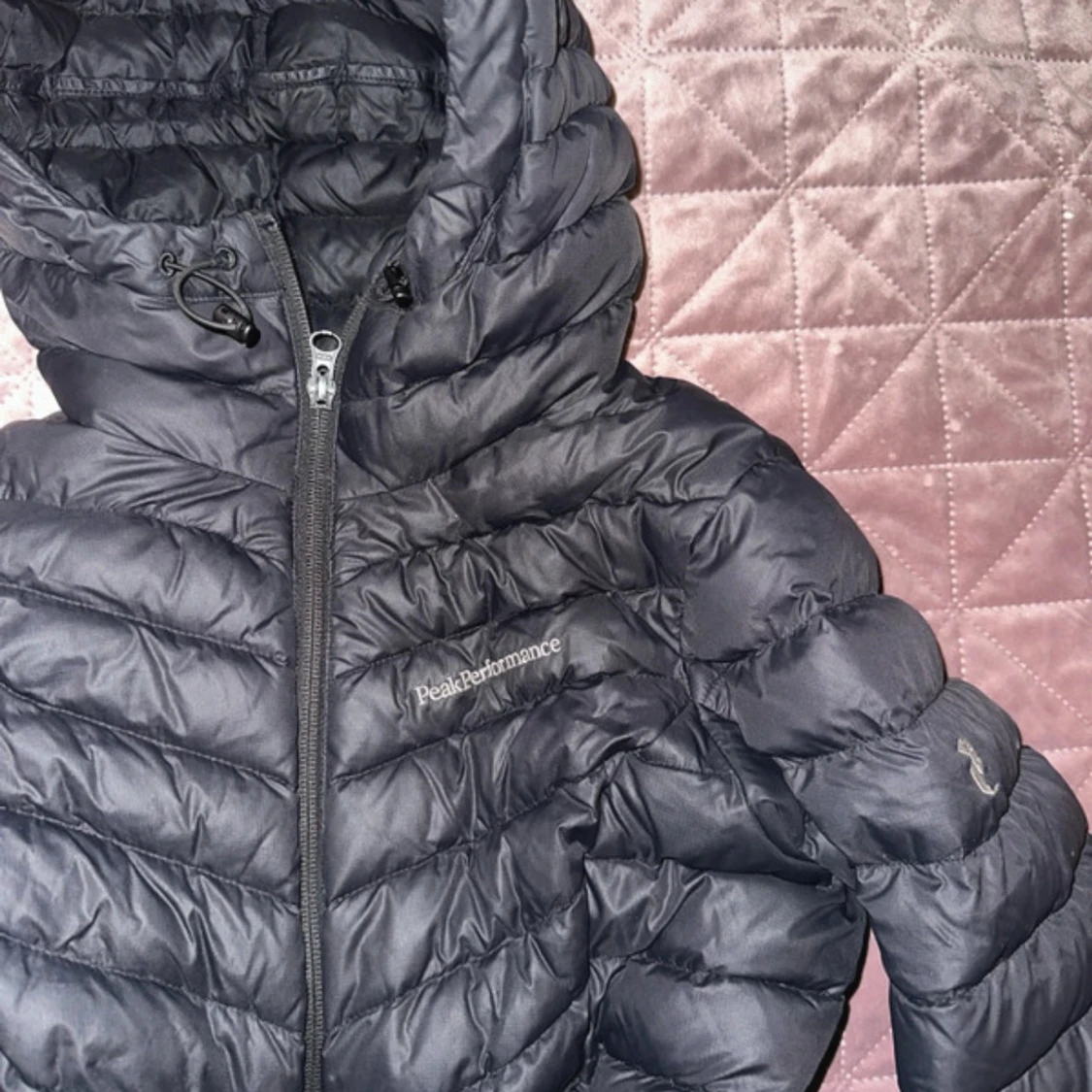 Säljer en svart dunjacka från Peak Performance med huva och snygga quiltade detaljer. Jackan har dragkedja framtill och Peak Performance-logga på bröstet. Perfekt för kalla dagar och har en modern, figurnära passform.