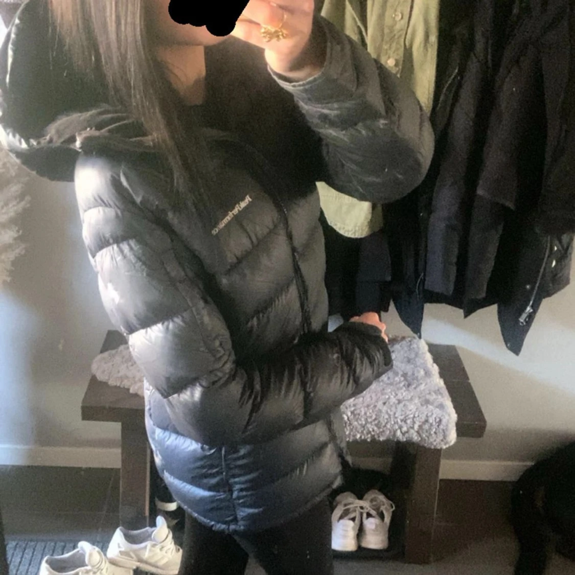 Säljer en svart dunjacka från Peak Performance med huva och dragkedja. Dragkedjan är utbytt men finns inga tecken på det. Jackan är en lite längre modell i storlek XS men skulle säga att den även passar S. Perfekt för kalla dagar och riktigt skön att bära. Klassisk logga på bröstet och ärmen. Jackan är i nyskick å i princip oanvänd, därmed inga defekter alls. Fråga gärna om fler bilder om det behövs❣️
