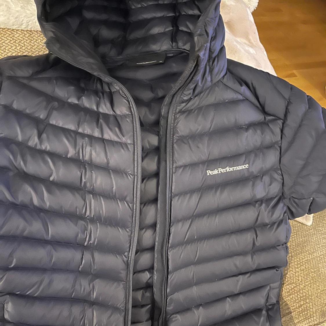 Säljer en stilren svart dunjacka från Peak Performance. Jackan har en praktisk huva och dragkedja framtill. Perfekt för kyliga dagar.