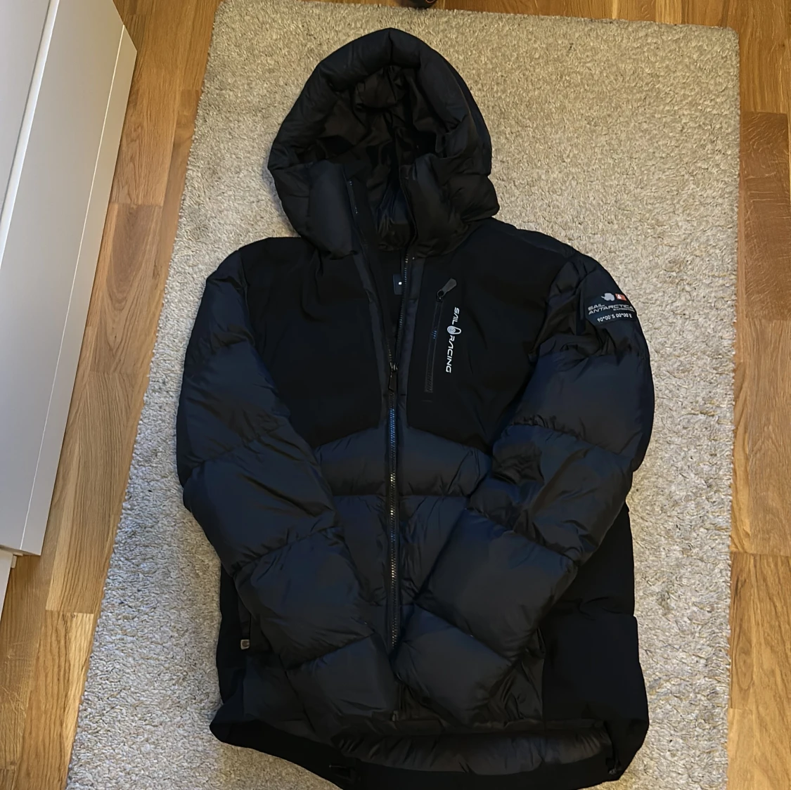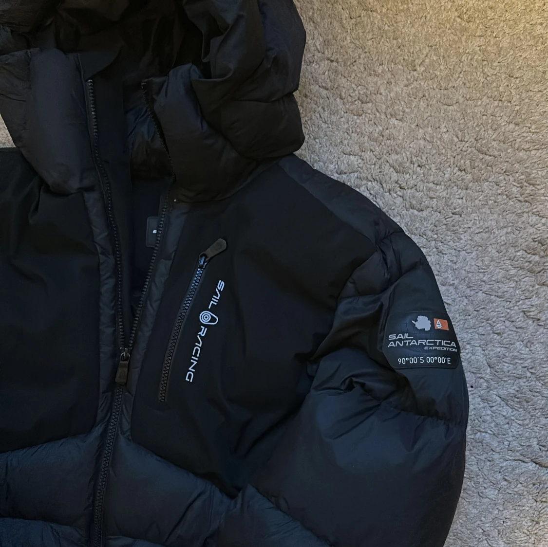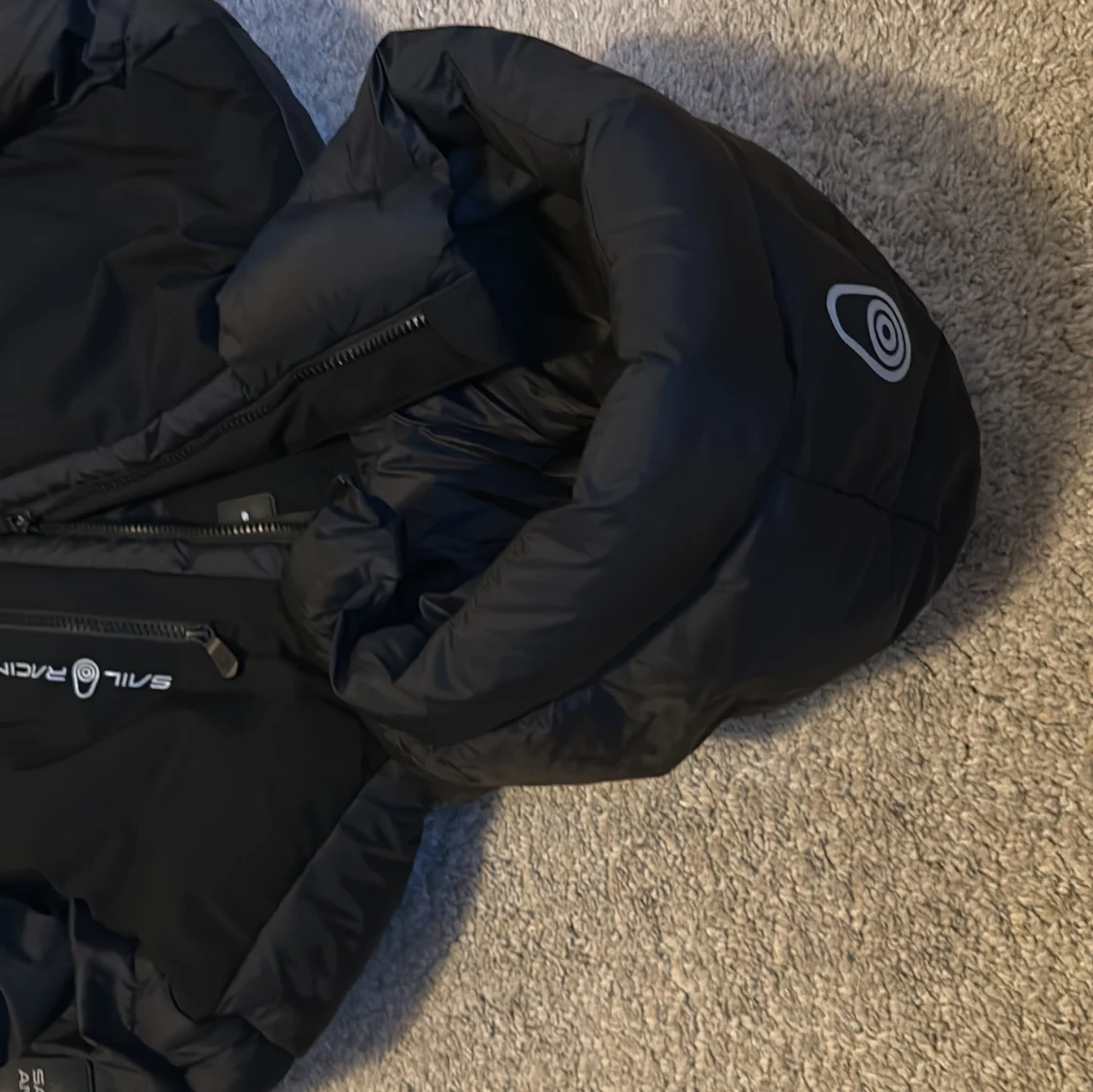 Säljer en svart dunjacka från Sail Racing med huva och dragkedja. Jackan har logga på bröstet och ärmen samt en bröstficka med dragkedja. Perfekt för kalla dagar och riktigt snygg streetstil. I princip ny, använd några fåtal gånger. Kan gå ned i pris för snabb affär!