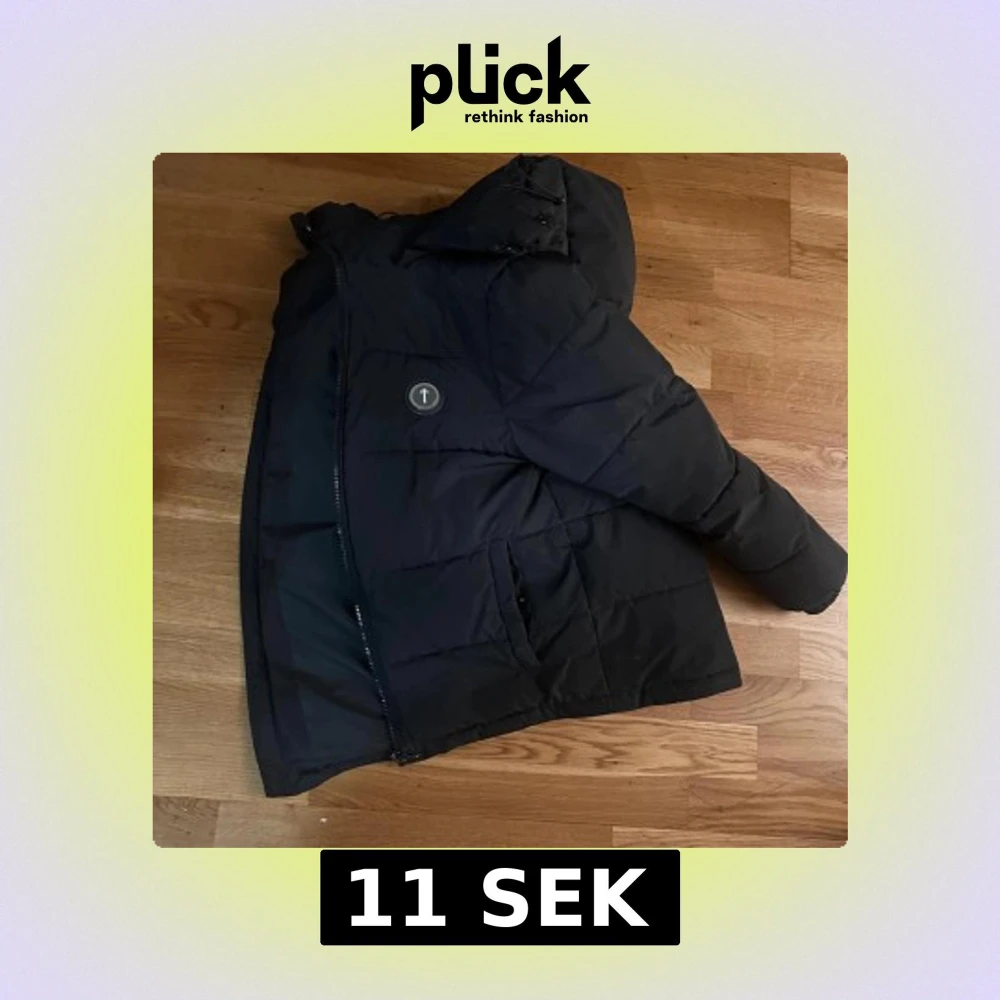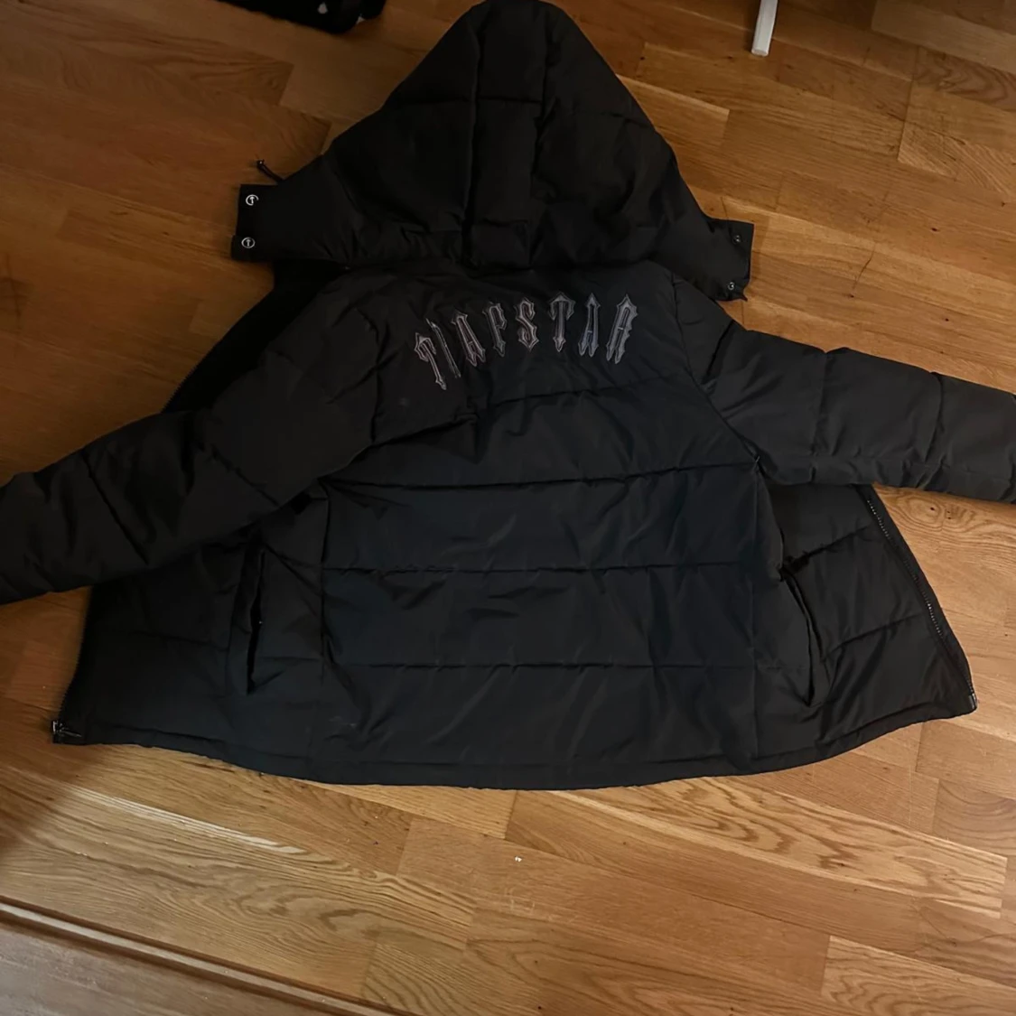Snygg svart dunjacka från Trapstar med huva och dragkedja. Jackan har ett broderat märke på ryggen och praktiska fickor framtill. Perfekt för kyliga dagar.