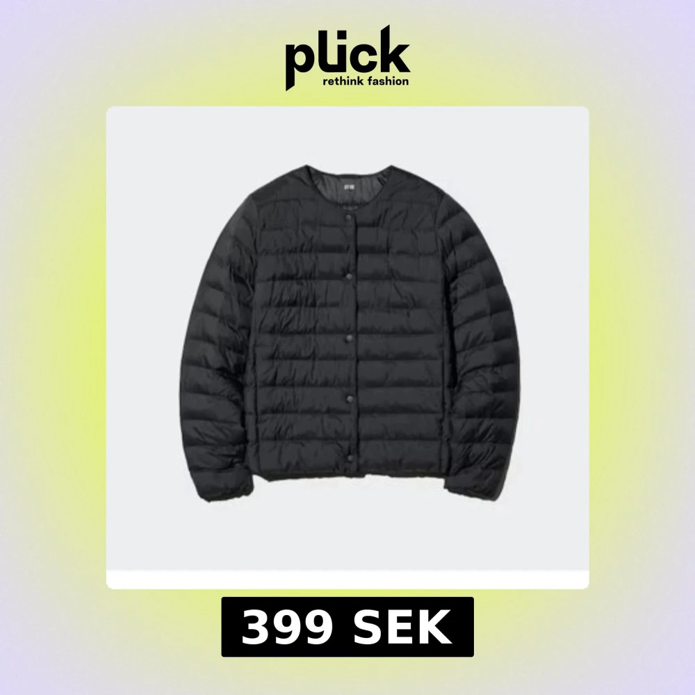 Lätt och smidig svart dunjacka från Uniqlo med rund halsringning och knäppning framtill. Jackan har quiltad design och lång ärm, perfekt för lager-på-lager under kyliga dagar.