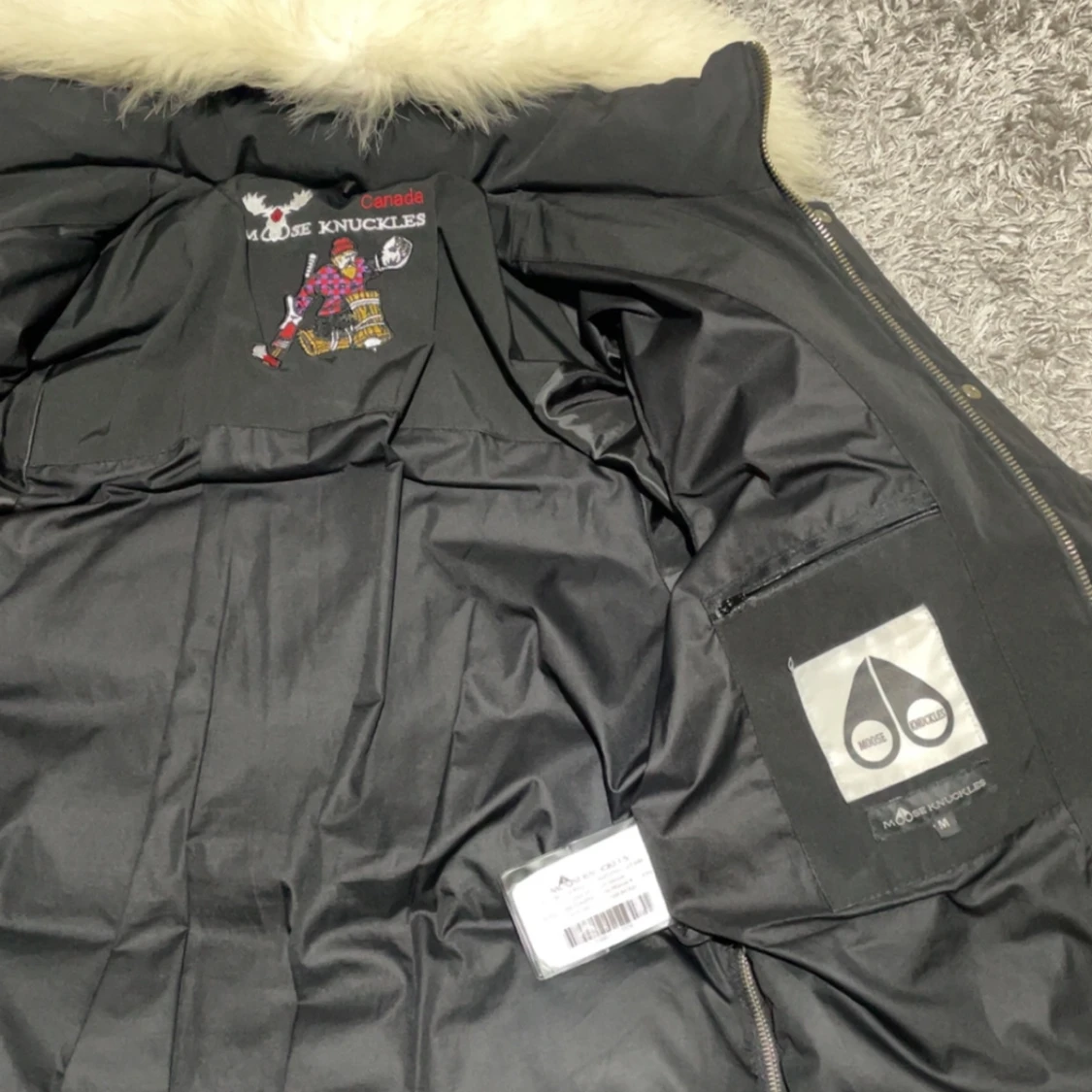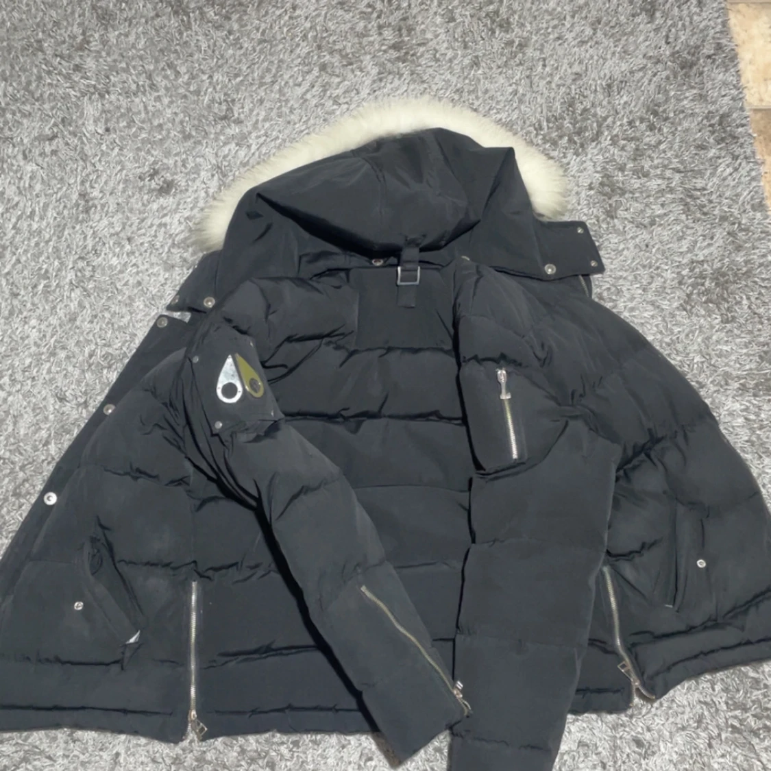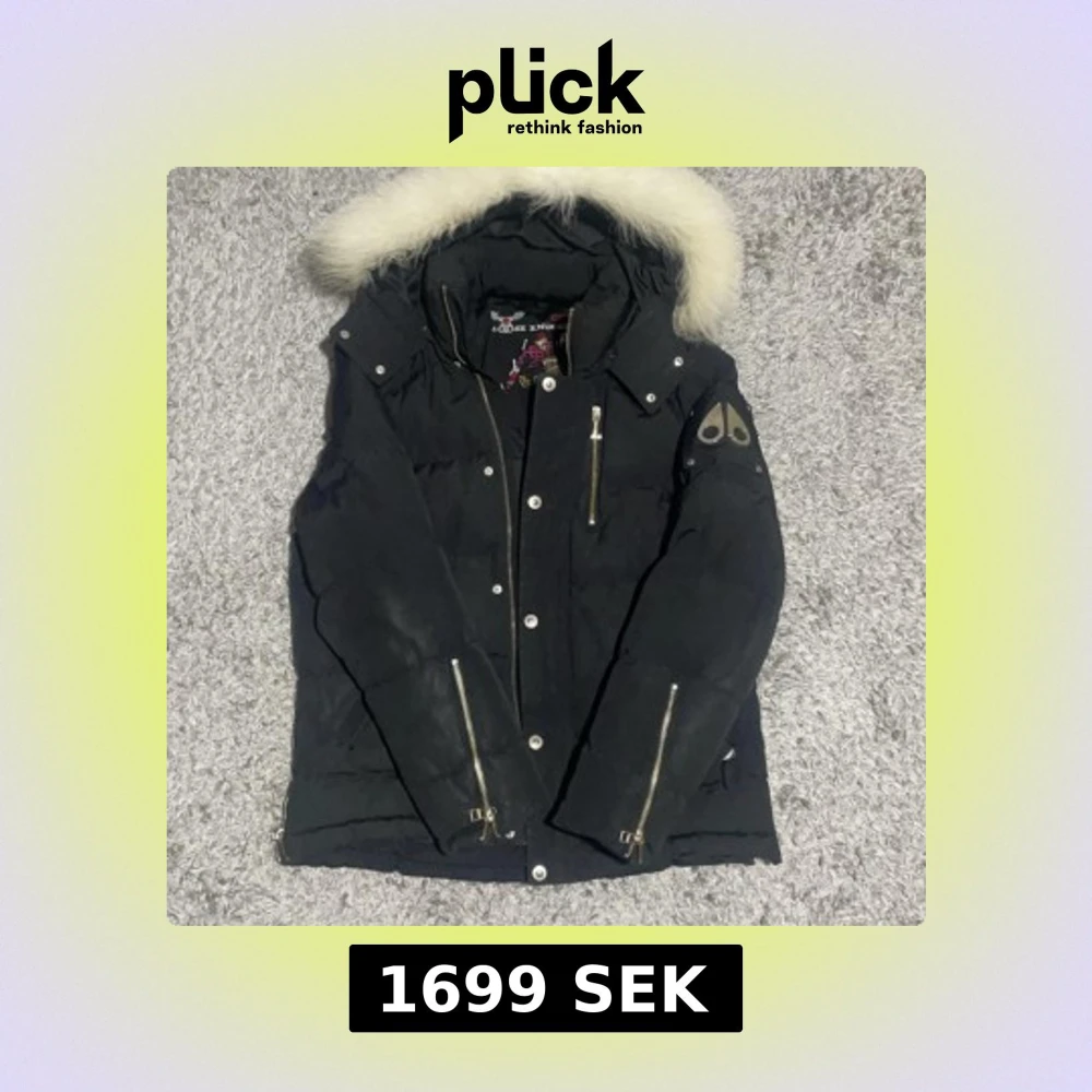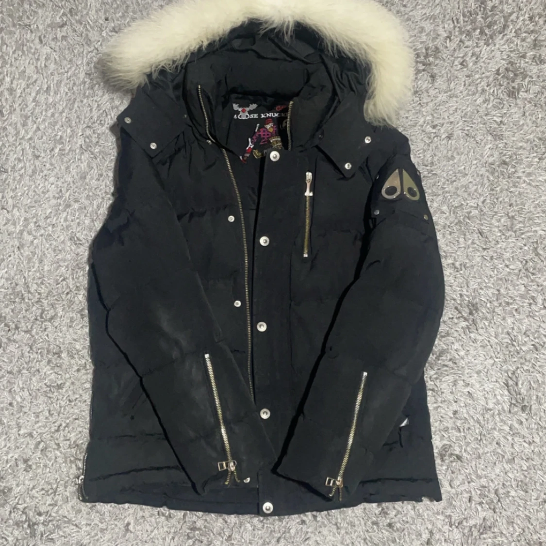 Svart dunjacka från Moose Knuckles med fluffig vit päls på huvan. Jackan har flera dragkedjor, knappar och coola detaljer på ärmen. Insidan har snyggt tryck och logga. Perfekt för kalla dagar och har en riktigt schysst streetstil.
