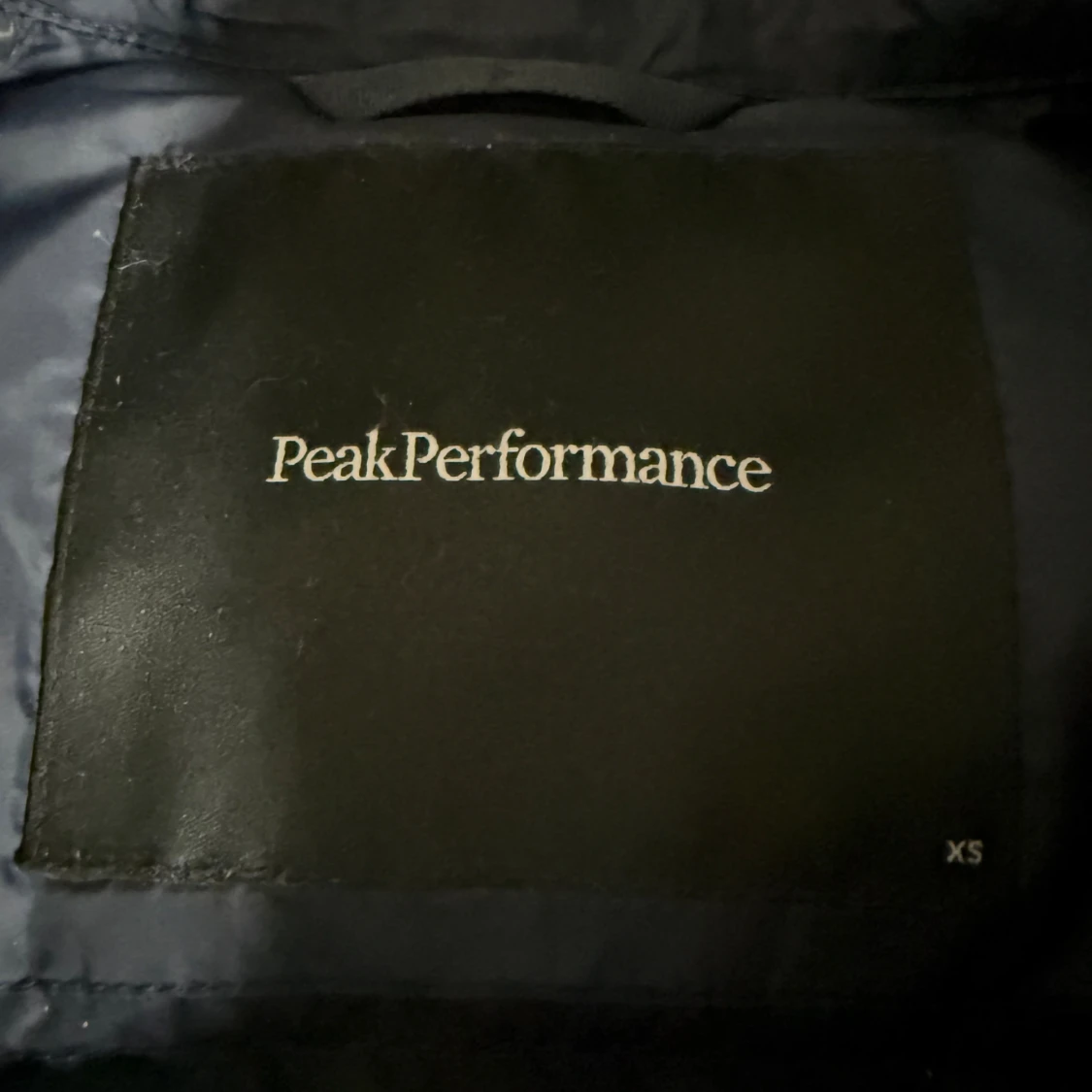 Snygg marinblå dunjacka från Peak Performance i storlek XS. Jackan har huva, dragkedja framtill och två fickor med dragkedja. Broderad logga på bröstet och ärmen. Perfekt för kalla dagar och riktigt skön att bära.