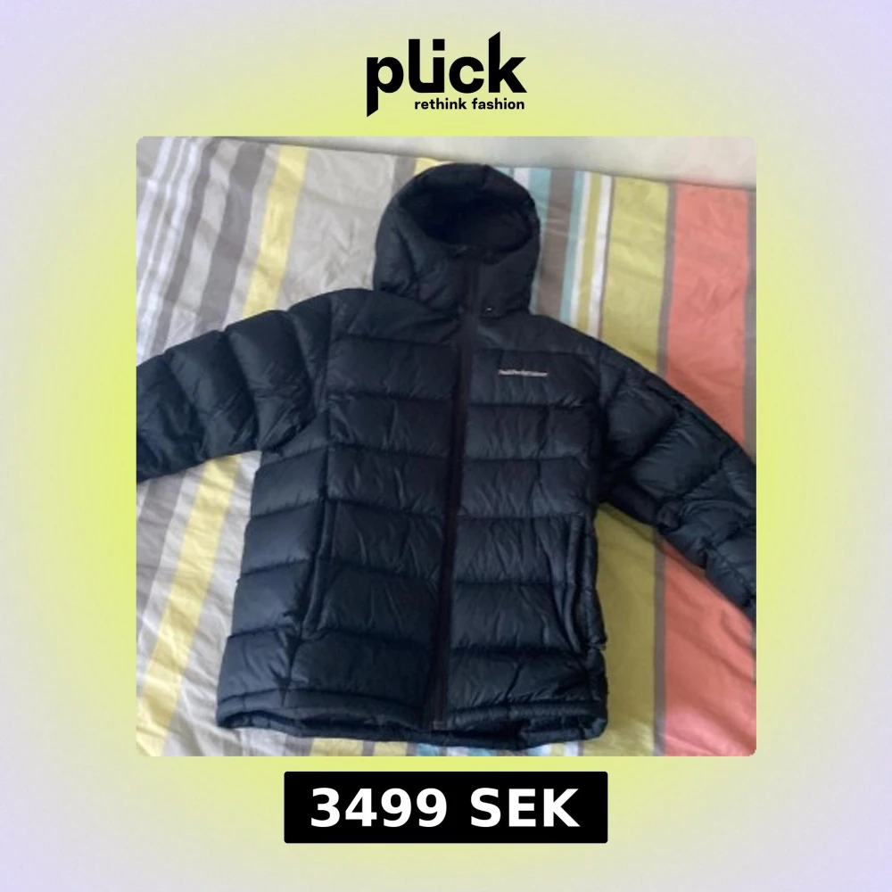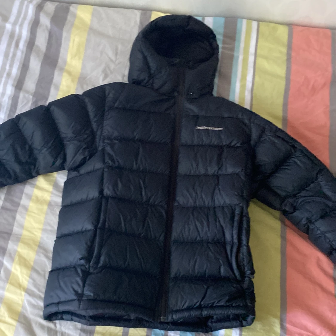 Säljer en svart dunjacka från Peak Performance med huva och hel dragkedja framtill. Jackan har en puffad design med horisontella sömmar och är perfekt för kalla dagar. Klassisk look som funkar till allt och har långärmade ärmar.