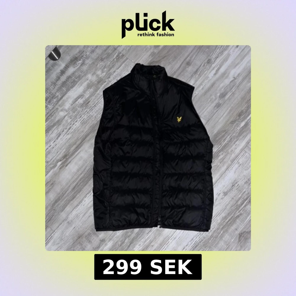 Säljer en stilren svart dunväst från Lyle & Scott med dragkedja och ett gult broderat emblem på bröstet. Perfekt för kyligare dagar och enkel att matcha med andra plagg.