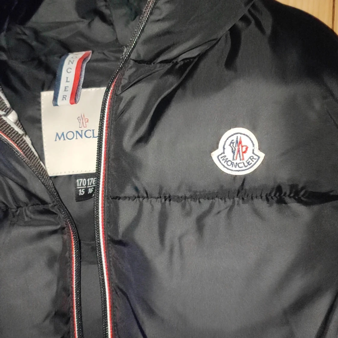 Svart dunväst från Moncler med huva och klassisk logga på bröstet. Västen har två fickor med dragkedja och snygga röda och vita detaljer längs dragkedjorna. Perfekt för lager-på-lager och streetstyle.