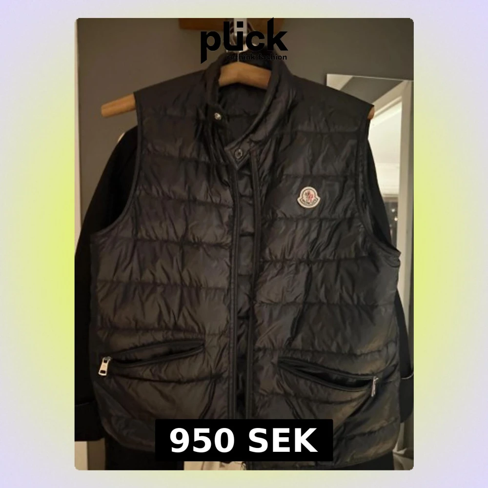 Snygg svart dunväst från Moncler med quiltad design och hög krage. Västen har två praktiska fickor med dragkedja framtill och Moncler-logga på bröstet. Perfekt att slänga över en hoodie för extra värme och stil.