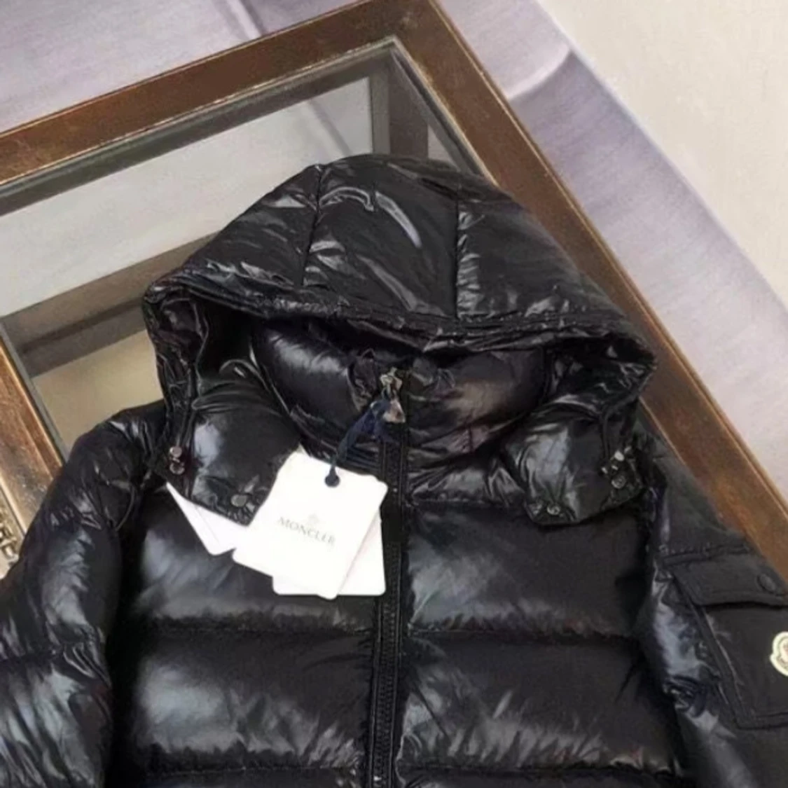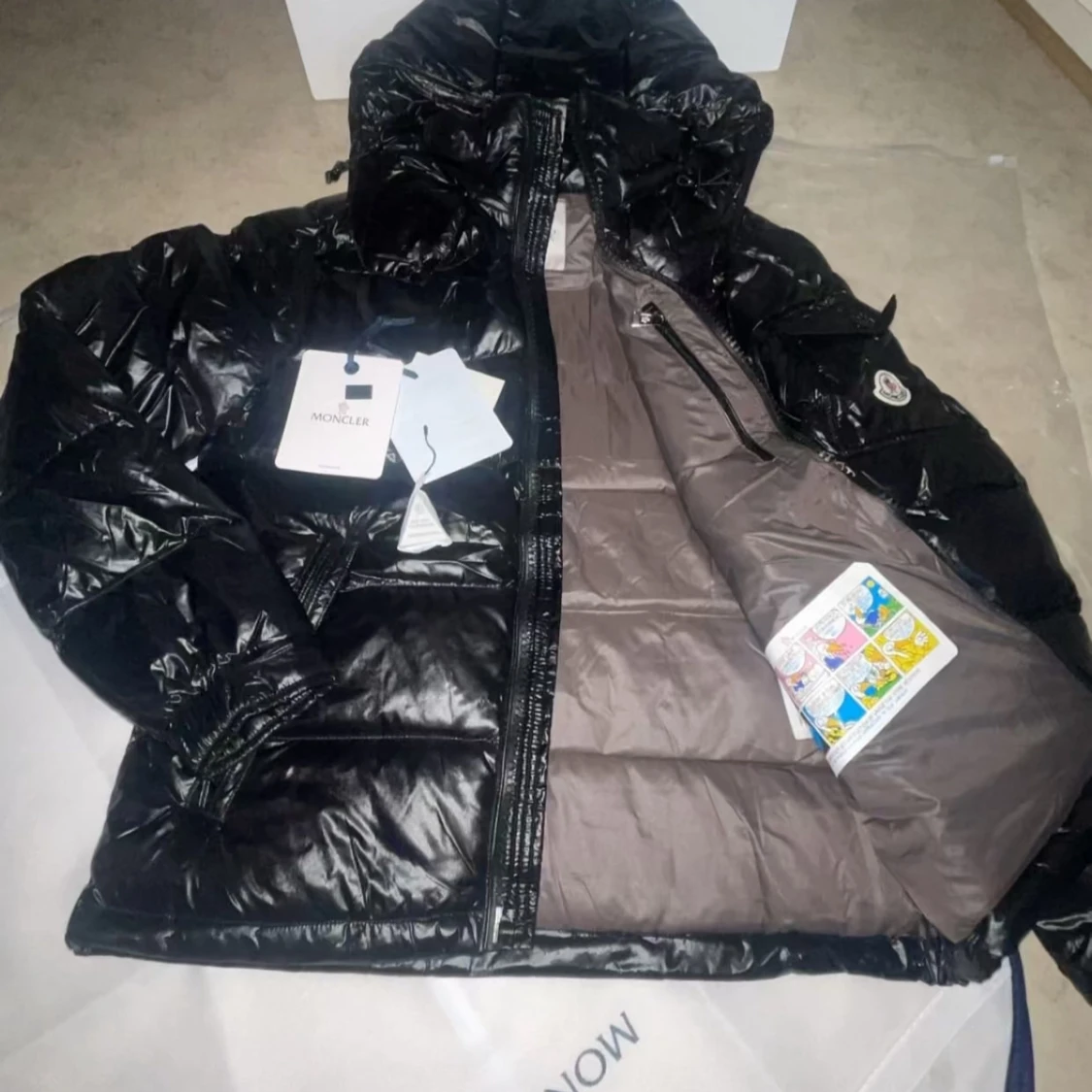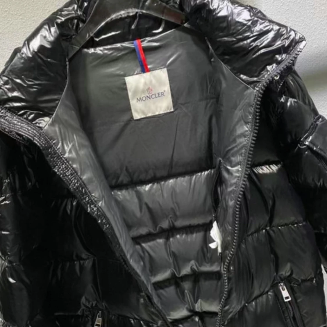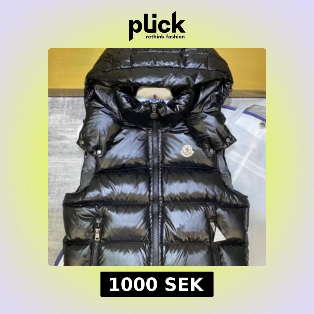 Snygg svart dunväst från Moncler med glansig yta och dragkedja framtill. Västen har en hög krage och två praktiska fickor med dragkedja. Perfekt för kyligare dagar när du vill hålla stilen.