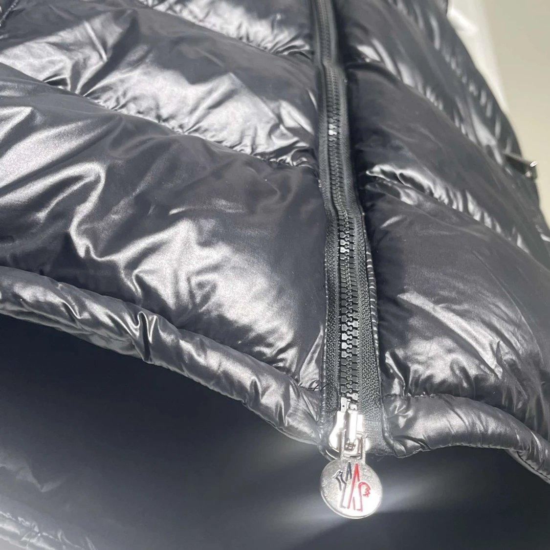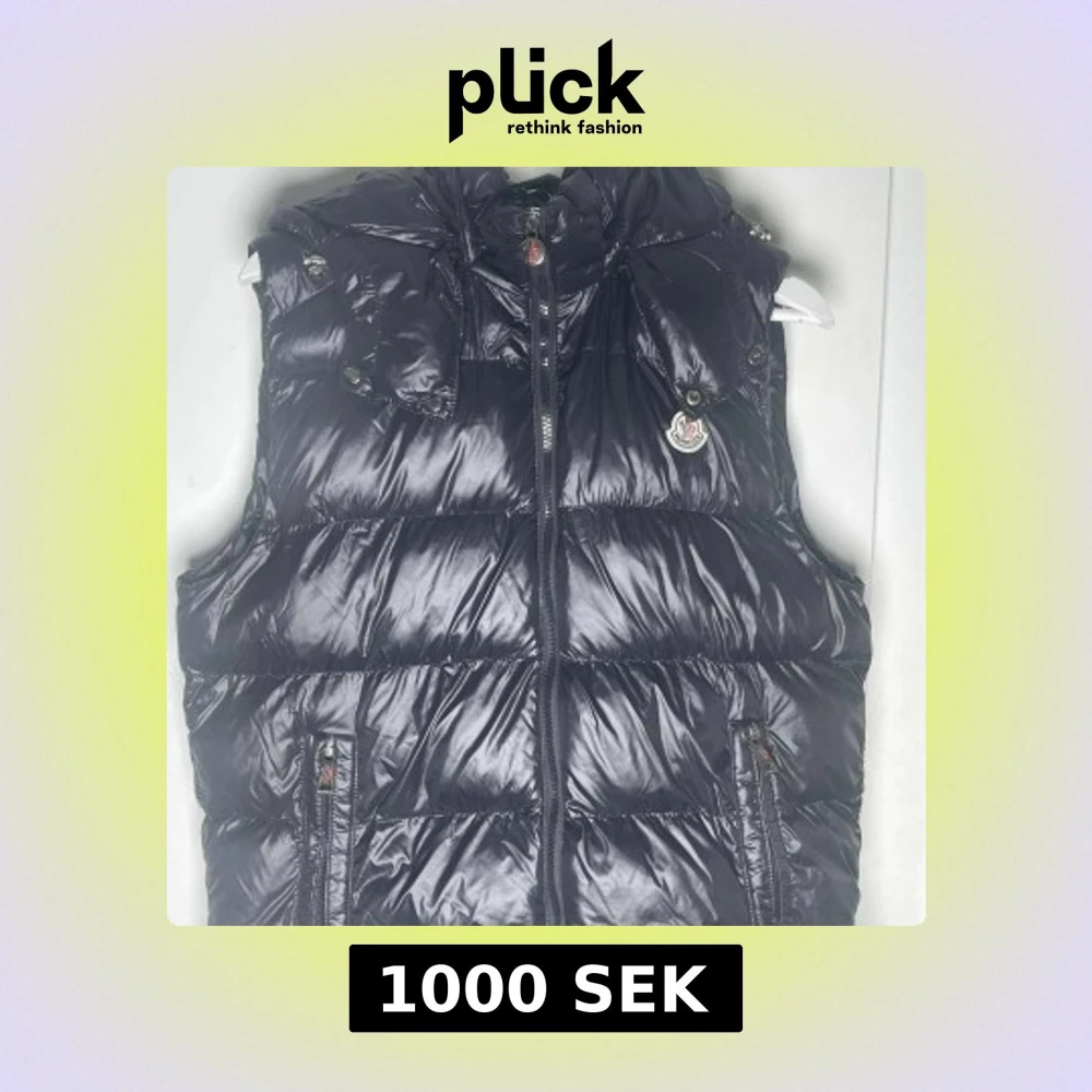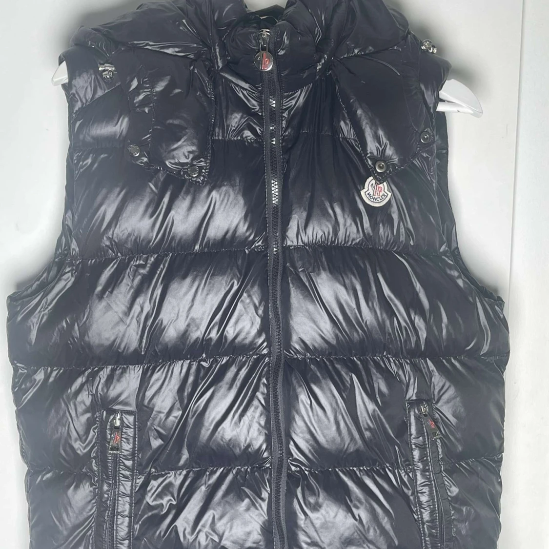 Snygg svart dunväst från Moncler med glansig finish och huva. Västen har dragkedja framtill, två fickor med dragkedja och klassisk Moncler-logga på bröstet. Perfekt för lager-på-lager och stilren look.
