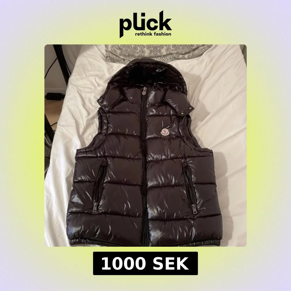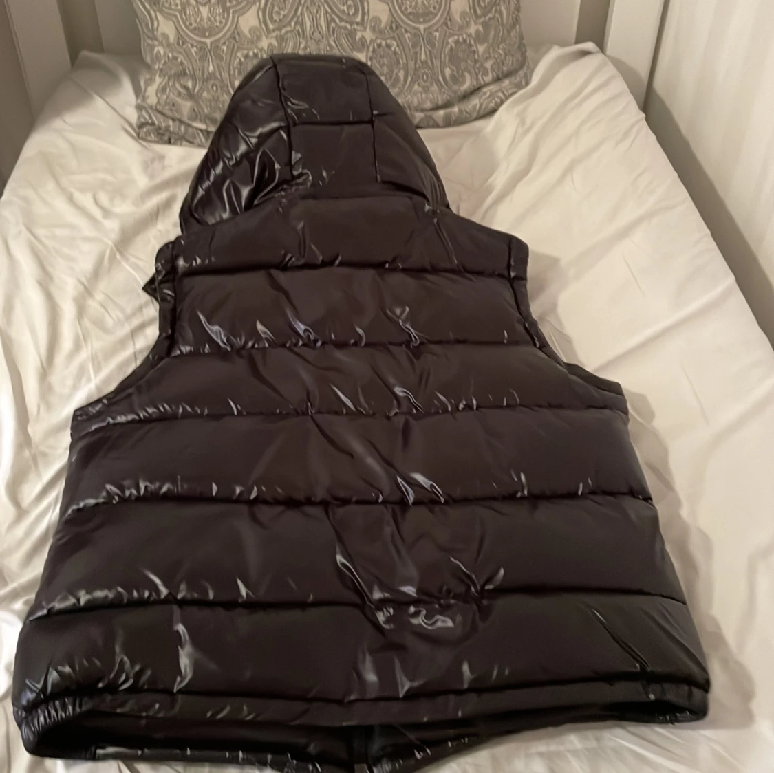 Säljer en svart, glansig dunväst från Moncler med avtagbar huva och två dragkedjefickor framtill. Västen har klassisk quiltad design och Moncler-logga på bröstet. Perfekt för lager-på-lager och streetstyle.