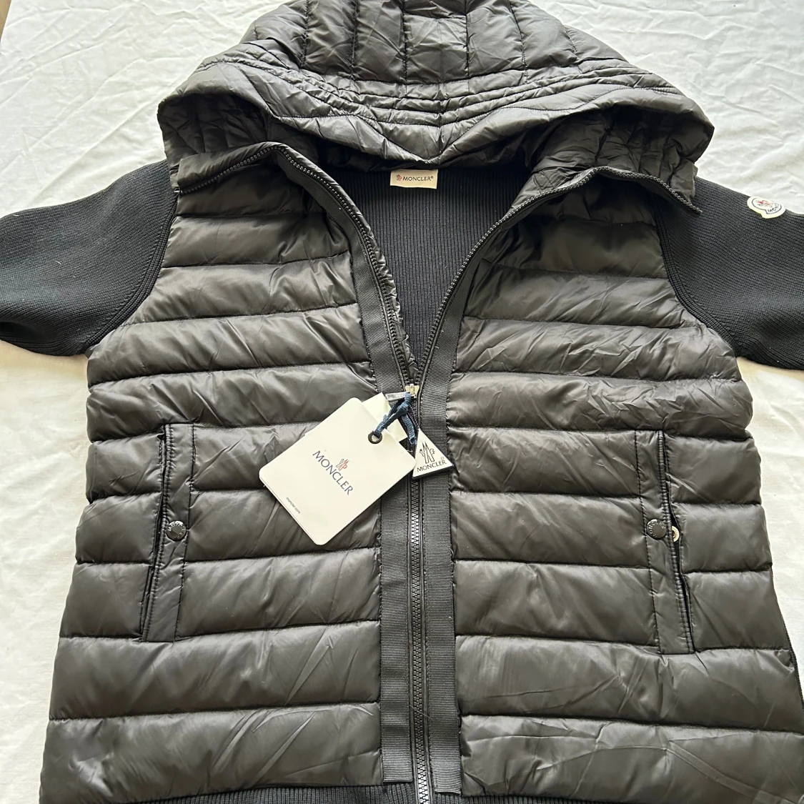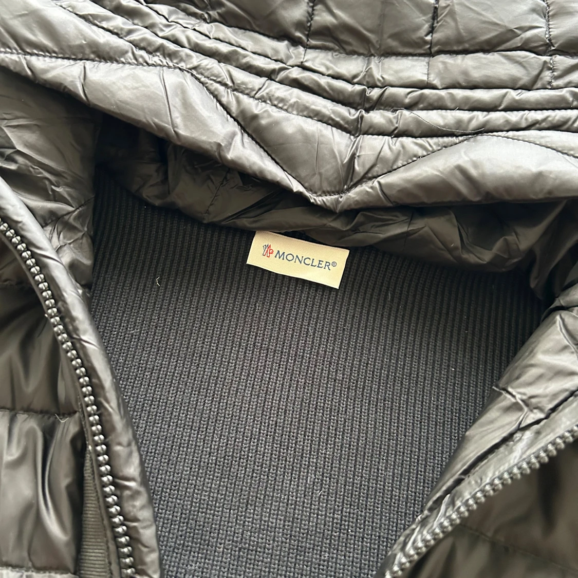 Svart dunväst från Moncler med quiltad design och huva. Västen har dragkedja framtill, två fickor med knappstängning och ribbstickade sidor. Märkeslogga på ärmen och snygga detaljer. Perfekt för lager-på-lager och streetstyle.