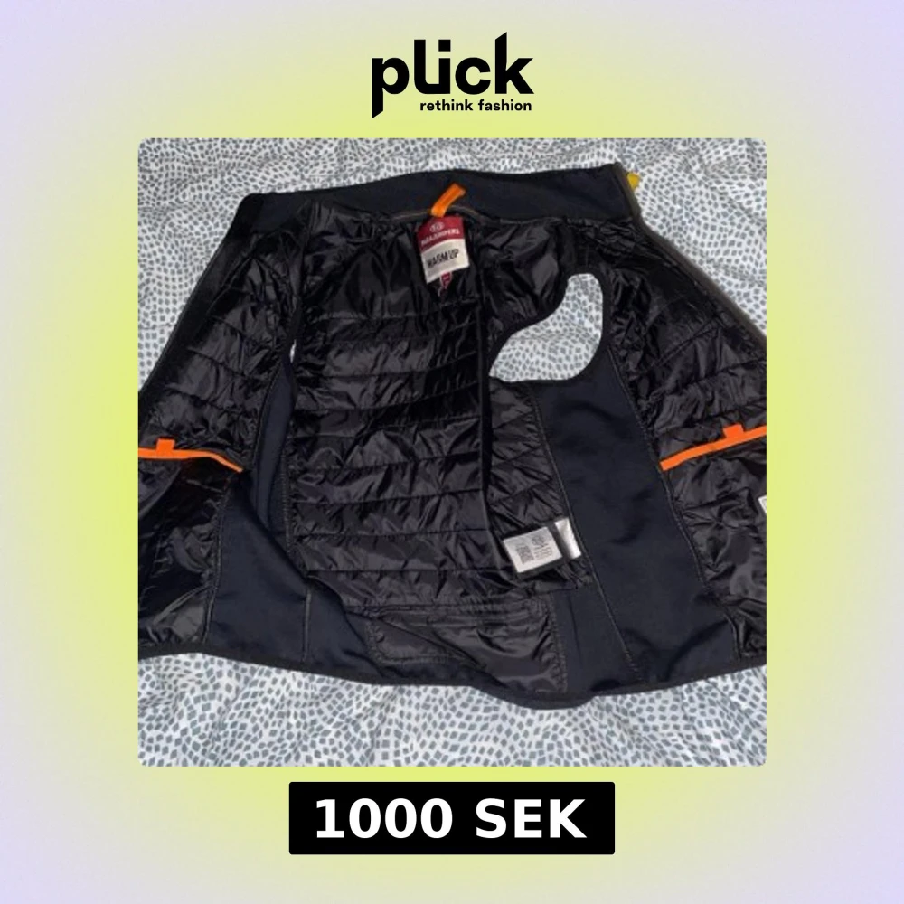 Svart dunväst från Parajumpers i storlek S. Västen har quiltad framsida, dragkedja och en gul detalj vid halsen. Snygg och sportig look med orangea detaljer och lätt glansigt material. Perfekt för lager-på-lager under kyliga dagar.
