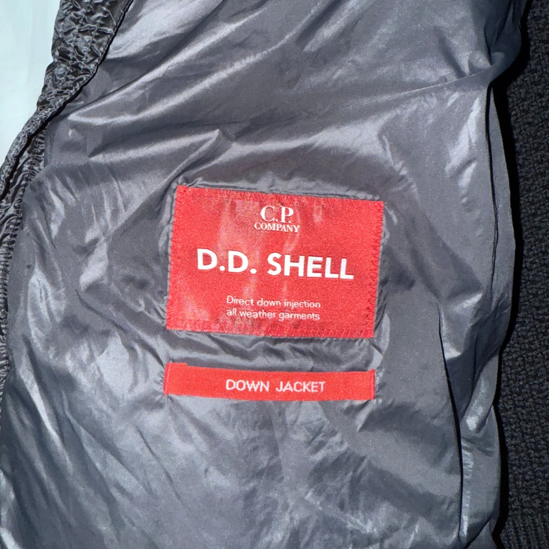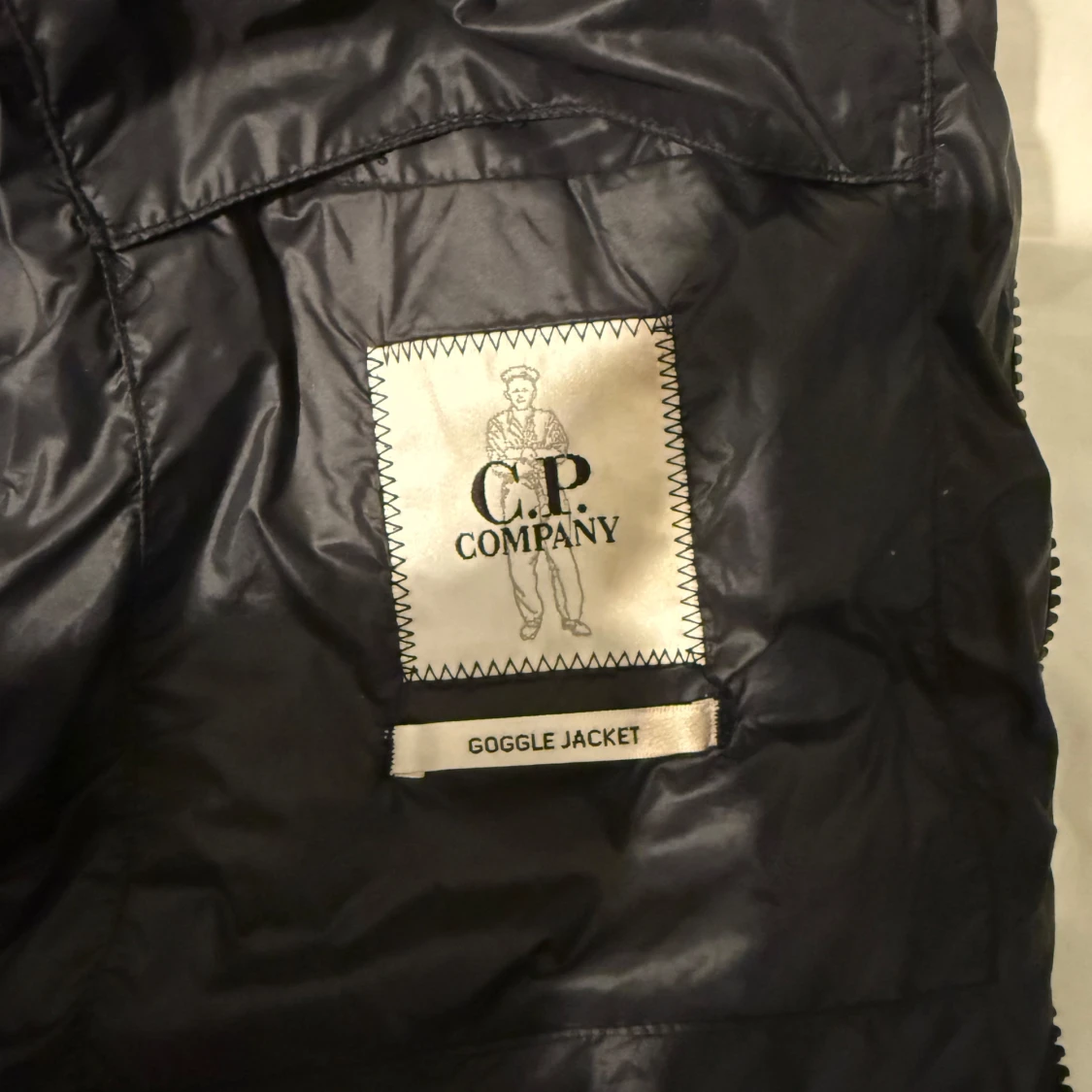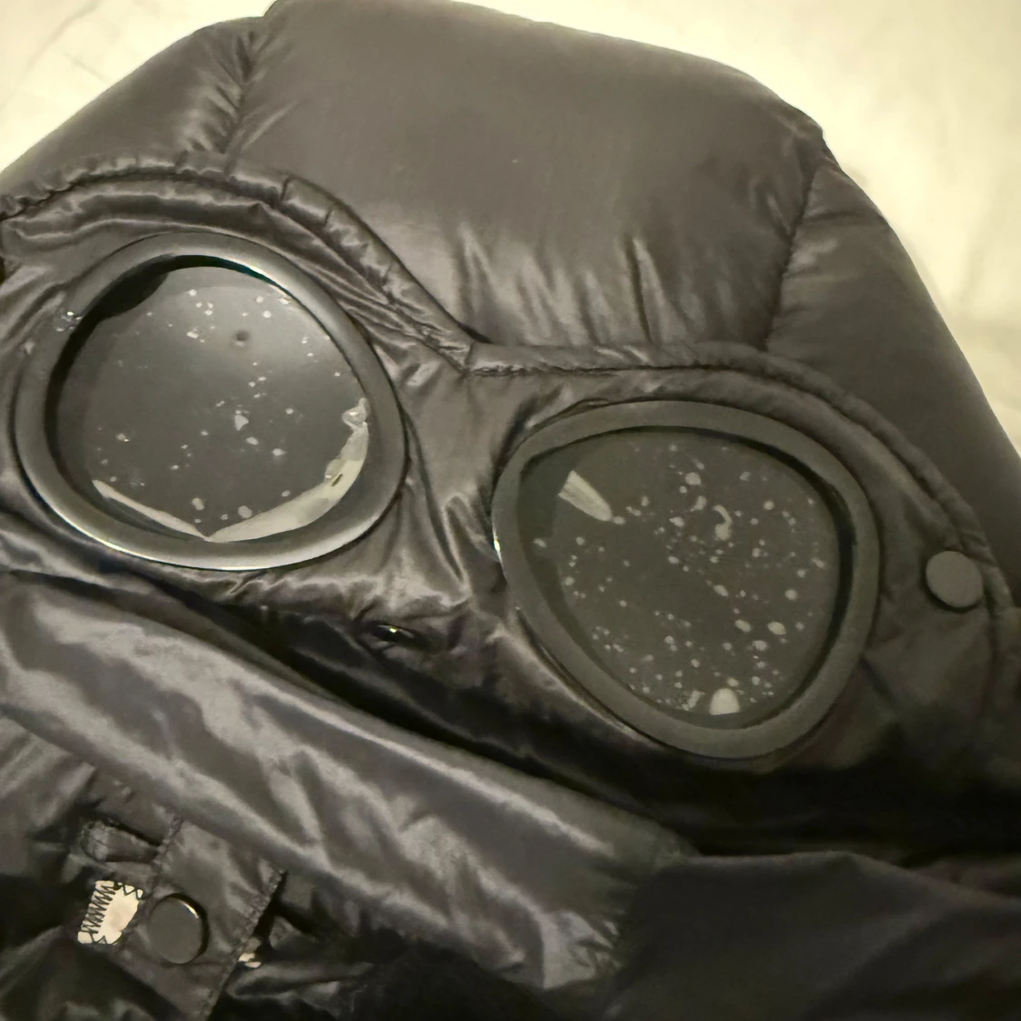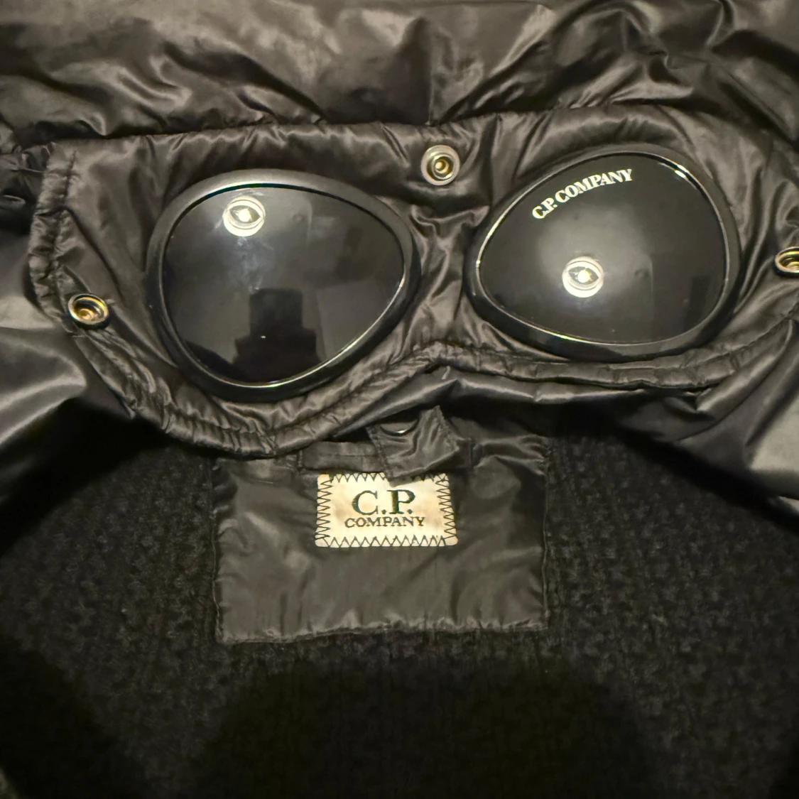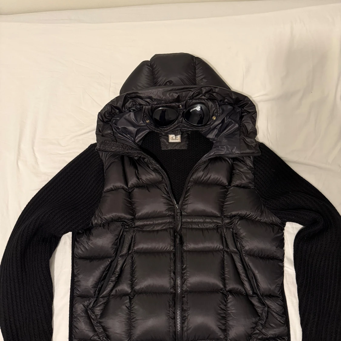 Säljer en svart dunväst från C.P. Company med ikonisk goggle-huva och dragkedja framtill. Västen har quiltad design och stickade svarta ärmar, vilket ger en unik look. Perfekt för dig som vill sticka ut med streetwear-vibe och funktionella detaljer.