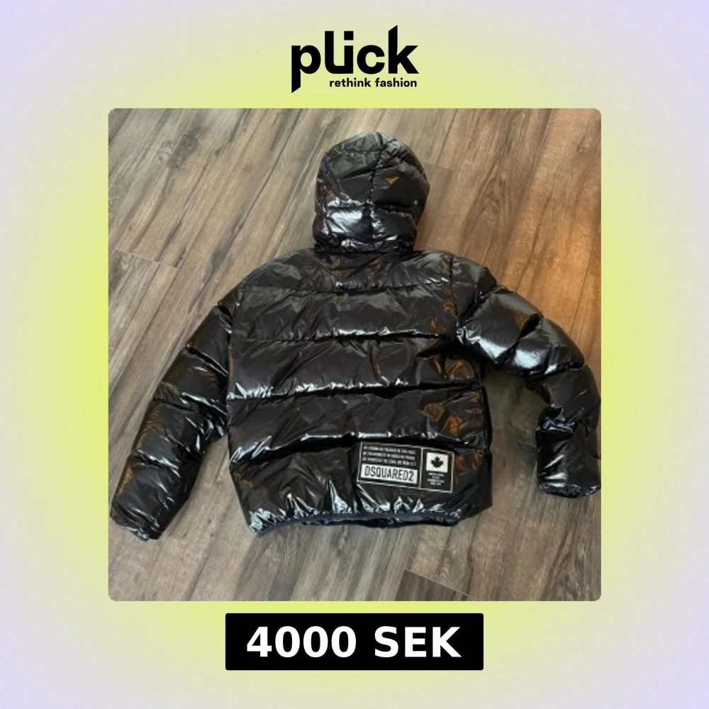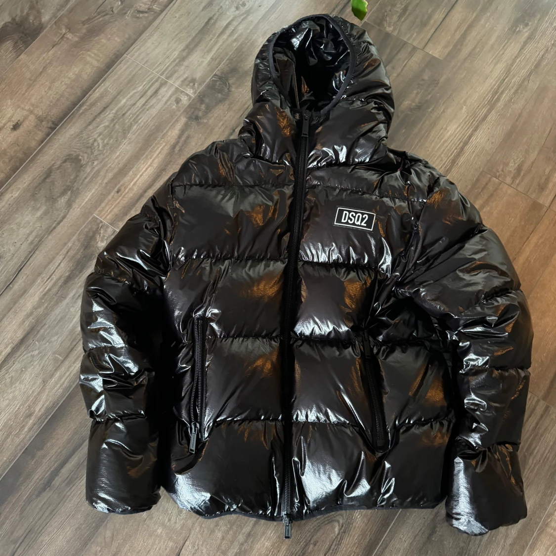 Snygg svart glansig pufferjacka från Dsquared2 med huva och dragkedja framtill. Jackan har en cool logga på bröstet och en större patch på ryggen. Perfekt för att hålla värmen med stil.