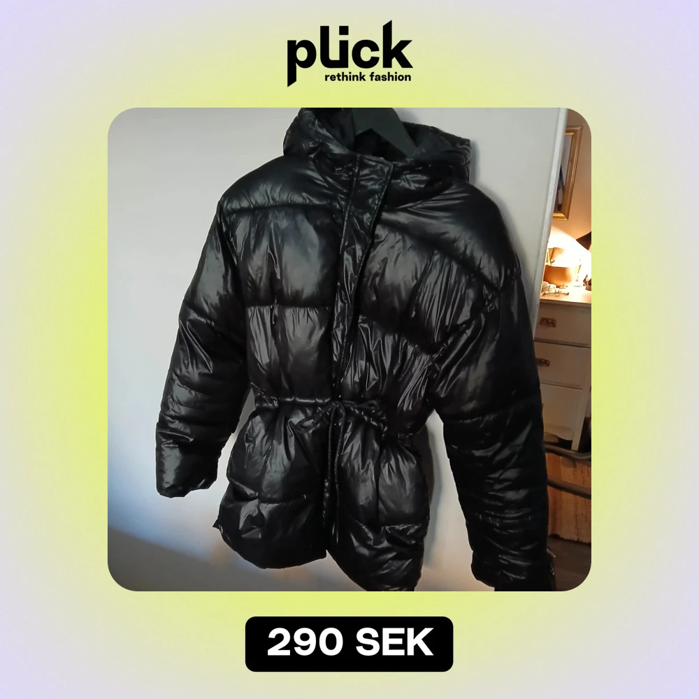 Säljer en svart pufferjacka i glansigt material. Jackan har en huva och knyts i midjan för en snygg passform. Perfekt för kalla vinterdagar. Den är i bra skick och redo för nya äventyr!