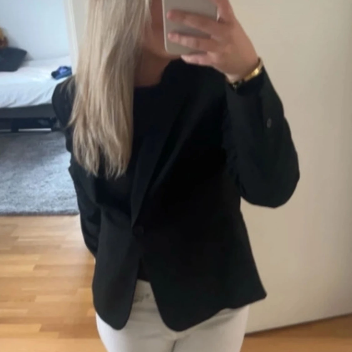 Säljer en klassisk svart kavaj med enkel knäppning framtill.