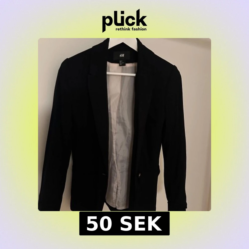 Snygg svart kavaj från H&M i storlek S. Perfekt för en stilren look med klassisk design och långa ärmar. Kavajen har en enkel knäppning framtill och är fodrad med ett ljust tyg.