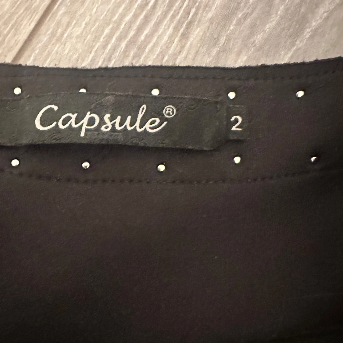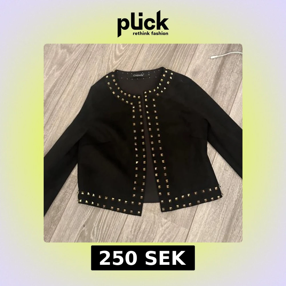 Svart kavaj från Capsule med coola guldfärgade nitar längs krage, öppning och nederkant. Jackan har en rak, croppad passform och långa ärmar. Perfekt för dig som vill sticka ut med en edgy och trendig look. Jackan har svart mocka material